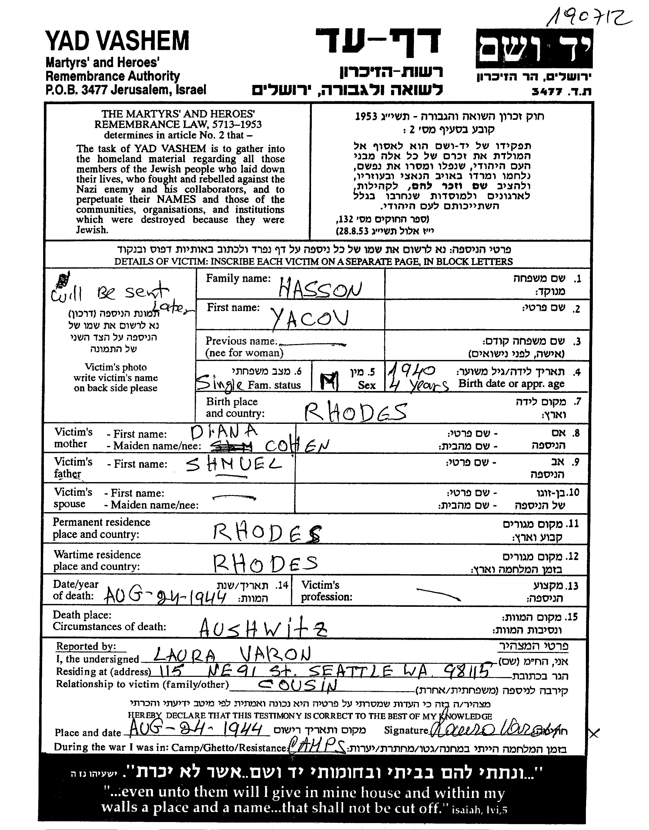 Yacov Hasson wurde im Jahr 1940 in Rhodes, Italien geboren. Er war der Sohn von Shmuel und Diana, geb. Cohen. Er war Kind. Vor dem Zweiten Weltkrieg lebte er in Rhodes, Italien. Während des Krieges war er in Rhodes, Italien.