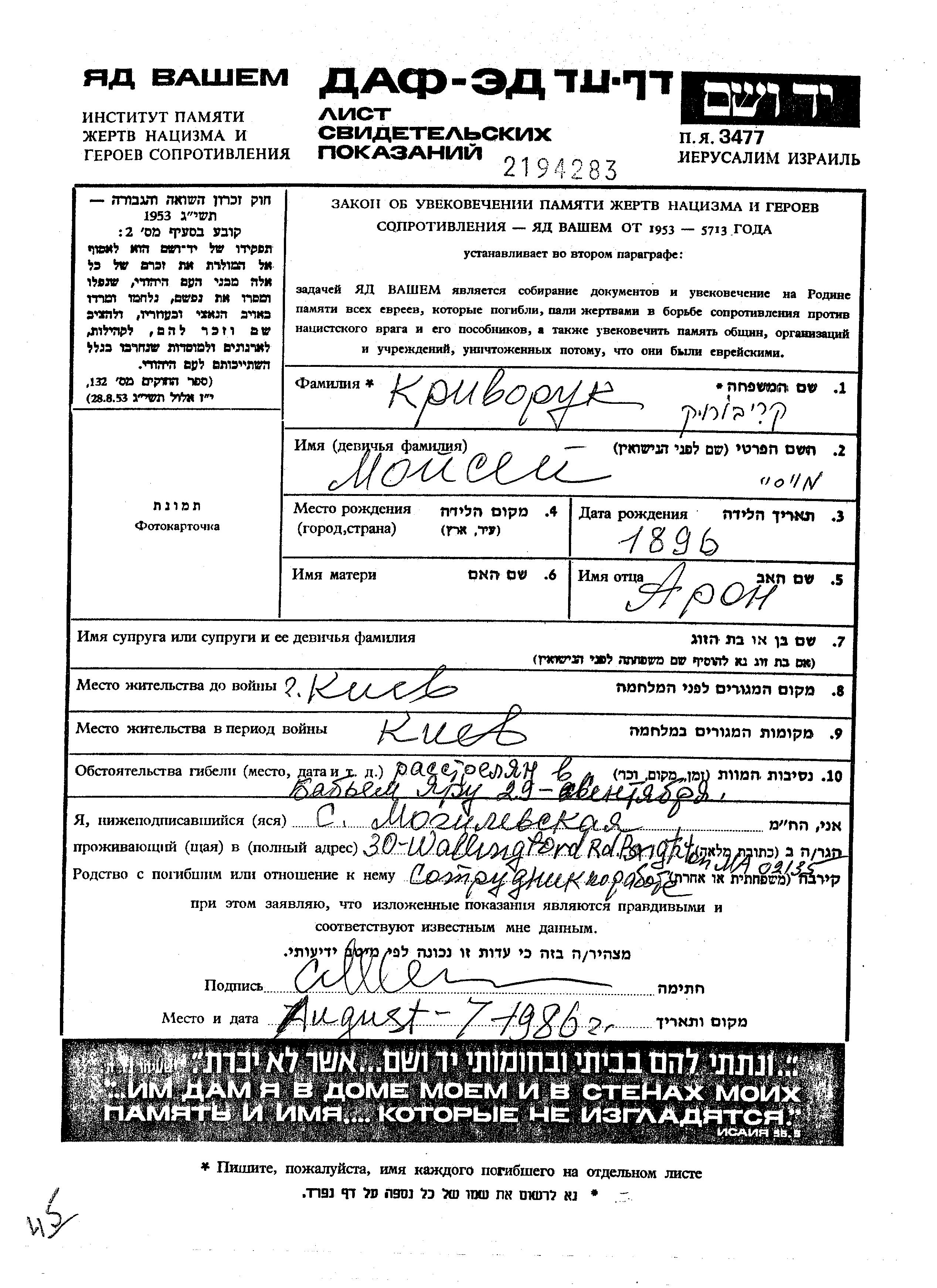 Moisei Krivoruk wurde im Jahr 1896 geboren. Er war der Sohn von Aron. Vor dem Zweiten Weltkrieg lebte er in Kiyev, Ukraine (UdSSR). Während des Krieges war er in Kiyev, Ukraine (UdSSR).
