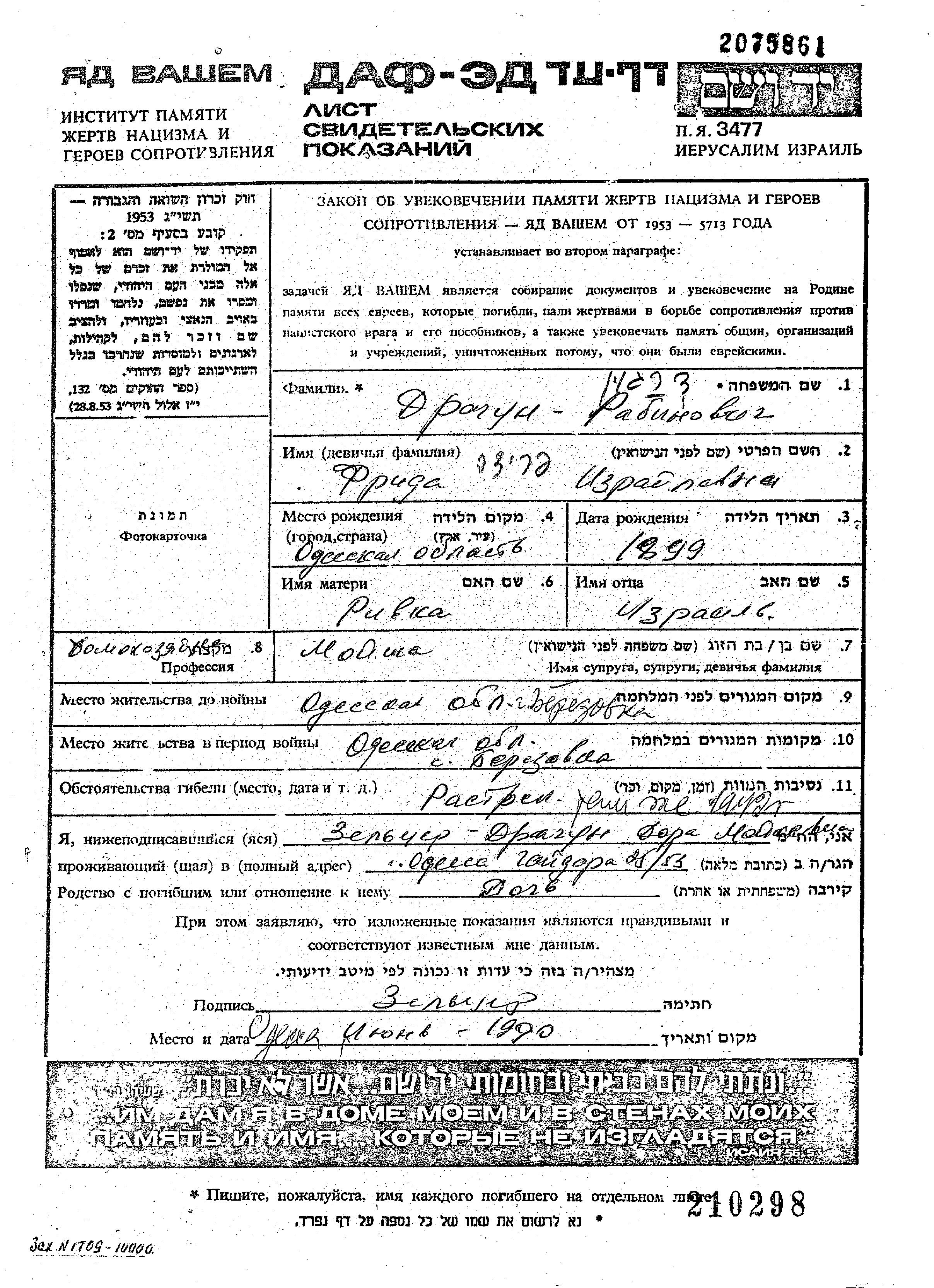 Frida Dragun Rabinovich, geb. Rabinovich wurde im Jahr 1899 in Odessa, Ukraine (UdSSR) geboren. Sie war die Tochter von Izrail und Rivka. Sie war Hausfrau und mit Moisha Verheiratet. Vor dem Zweiten Weltkrieg lebte sie in Berezovka, Ukraine (UdSSR). Während des Krieges war sie in Berezovka, Ukraine (UdSSR).