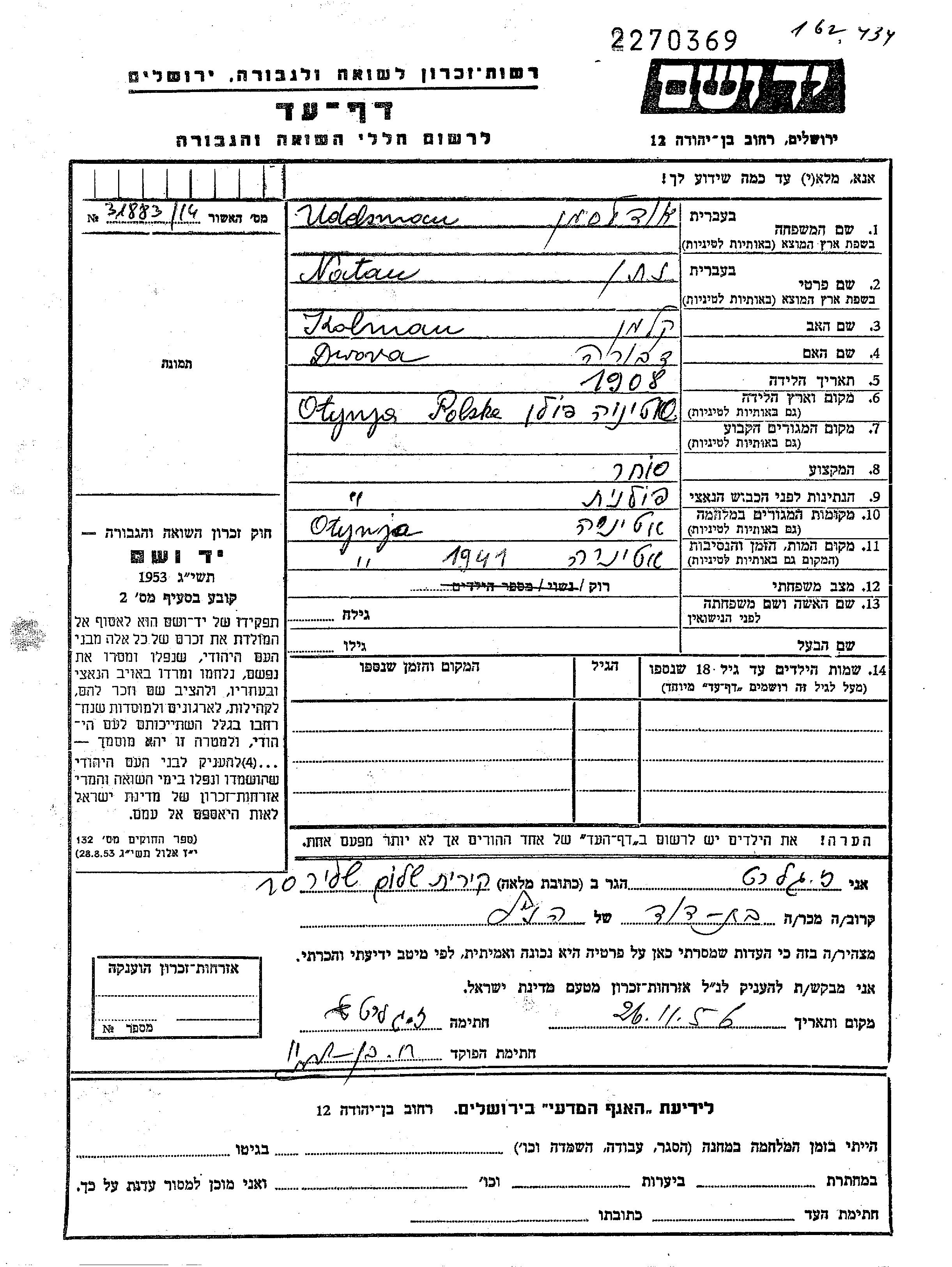 Natan Udelsman wurde im Jahr 1908 in Ottynia, Polen geboren. Er war der Sohn von Kalman und Dwora, geb. Shtoper. Er war Kaufmann/-frau und Ledig. Vor dem Zweiten Weltkrieg lebte er in Ottynia, Polen. Während des Krieges war er in Ottynia, Polen.