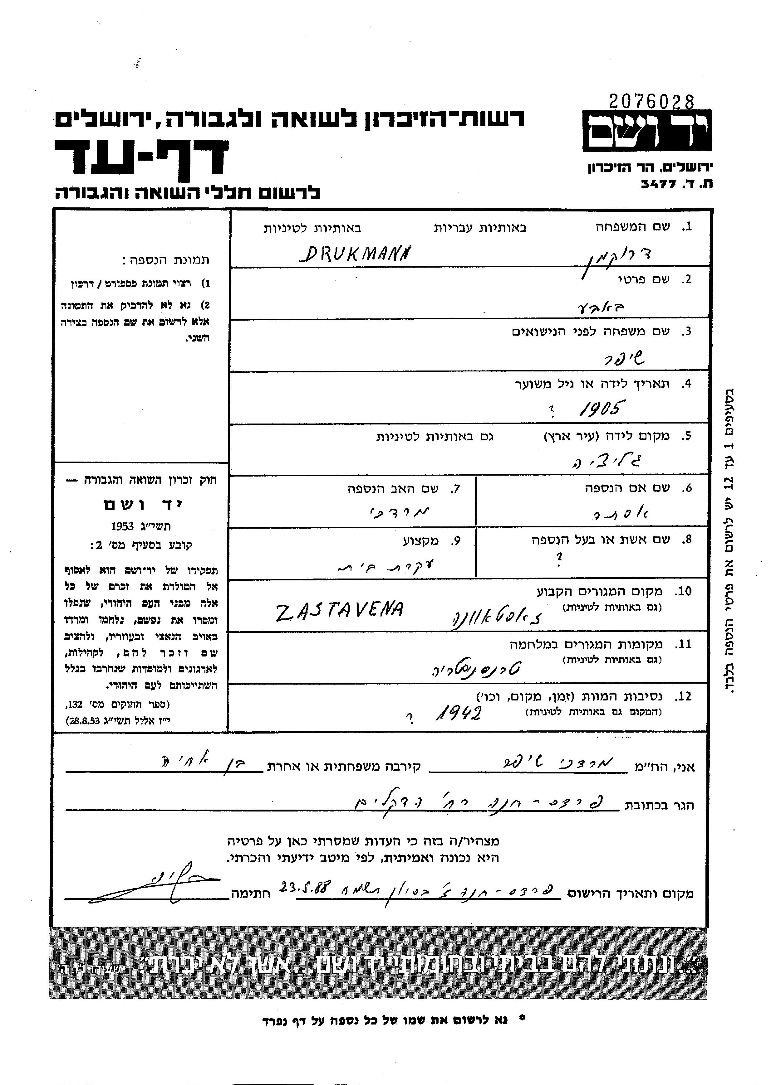 Beba Drukmann, geb. Shifer wurde in Galizien Region, Polen geboren. Sie war die Tochter von Mordekhai und Ester. Sie war Hausfrau und Verheiratet. Vor dem Zweiten Weltkrieg lebte sie in Zastavna, Rumänien. Während des Krieges war sie in Transnistria, Ukraine (UdSSR).