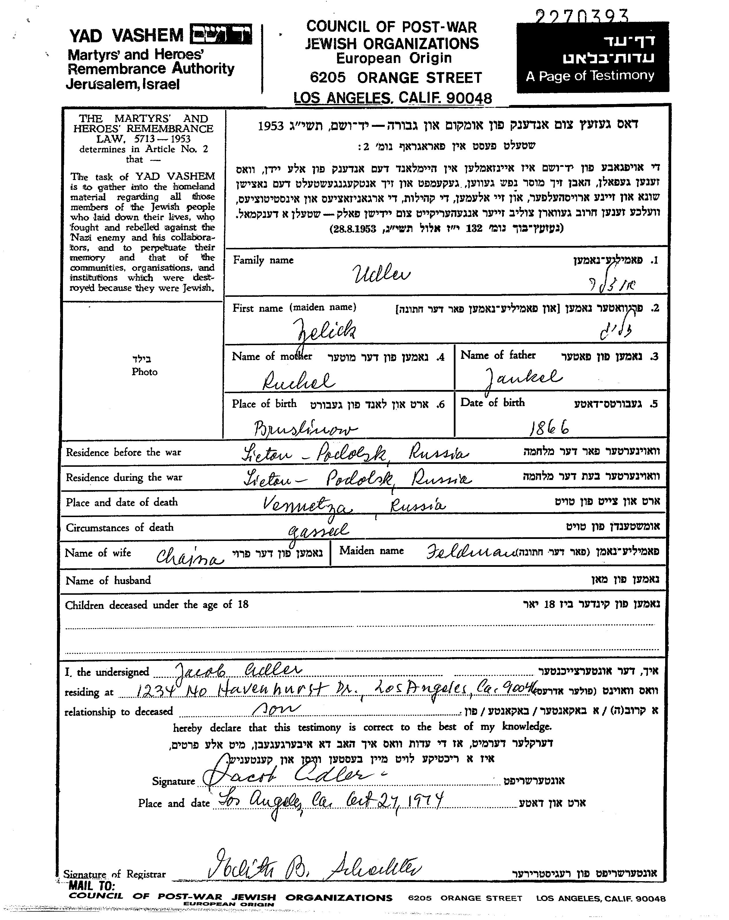 Zelick Udler wurde im Jahr 1866 in Bruslinov, Ukraine (UdSSR) geboren. Er war der Sohn von Yankel und Ruchel. Er war mit Chaina Verheiratet. Vor dem Zweiten Weltkrieg lebte er in Litin, Ukraine (UdSSR). Während des Krieges war er in Litin, Ukraine (UdSSR).