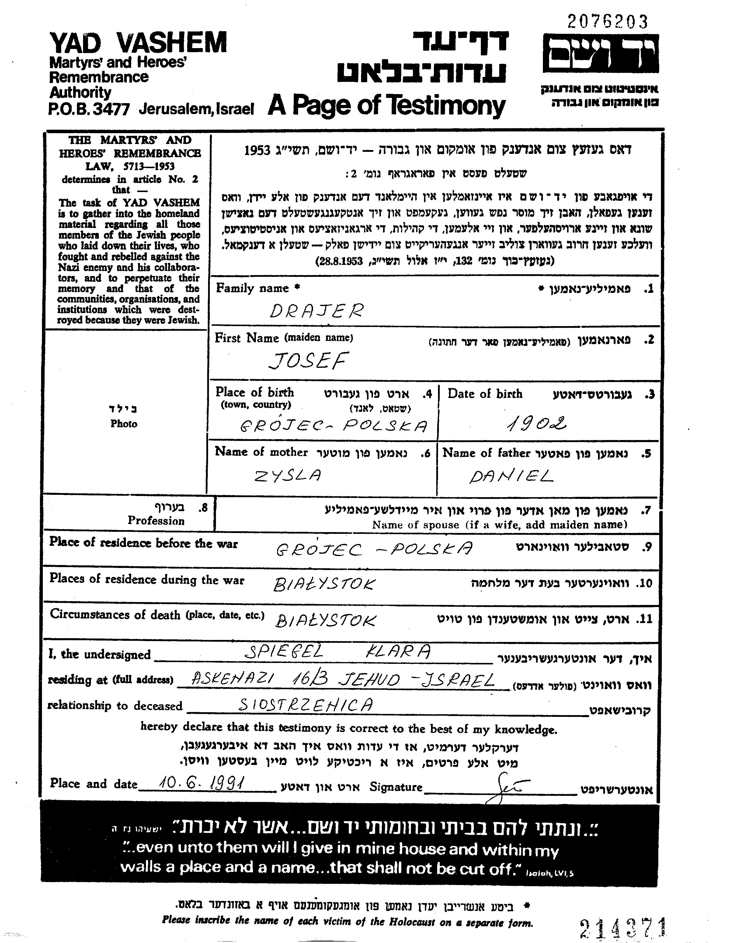 Josef Drajer wurde im Jahr 1902 in Grojec, Polen geboren. Er war der Sohn von Daniel und Zysl, geb. Rojtkop. Vor dem Zweiten Weltkrieg lebte er in Grojec, Polen. Während des Krieges war er in Bialystok, Polen.