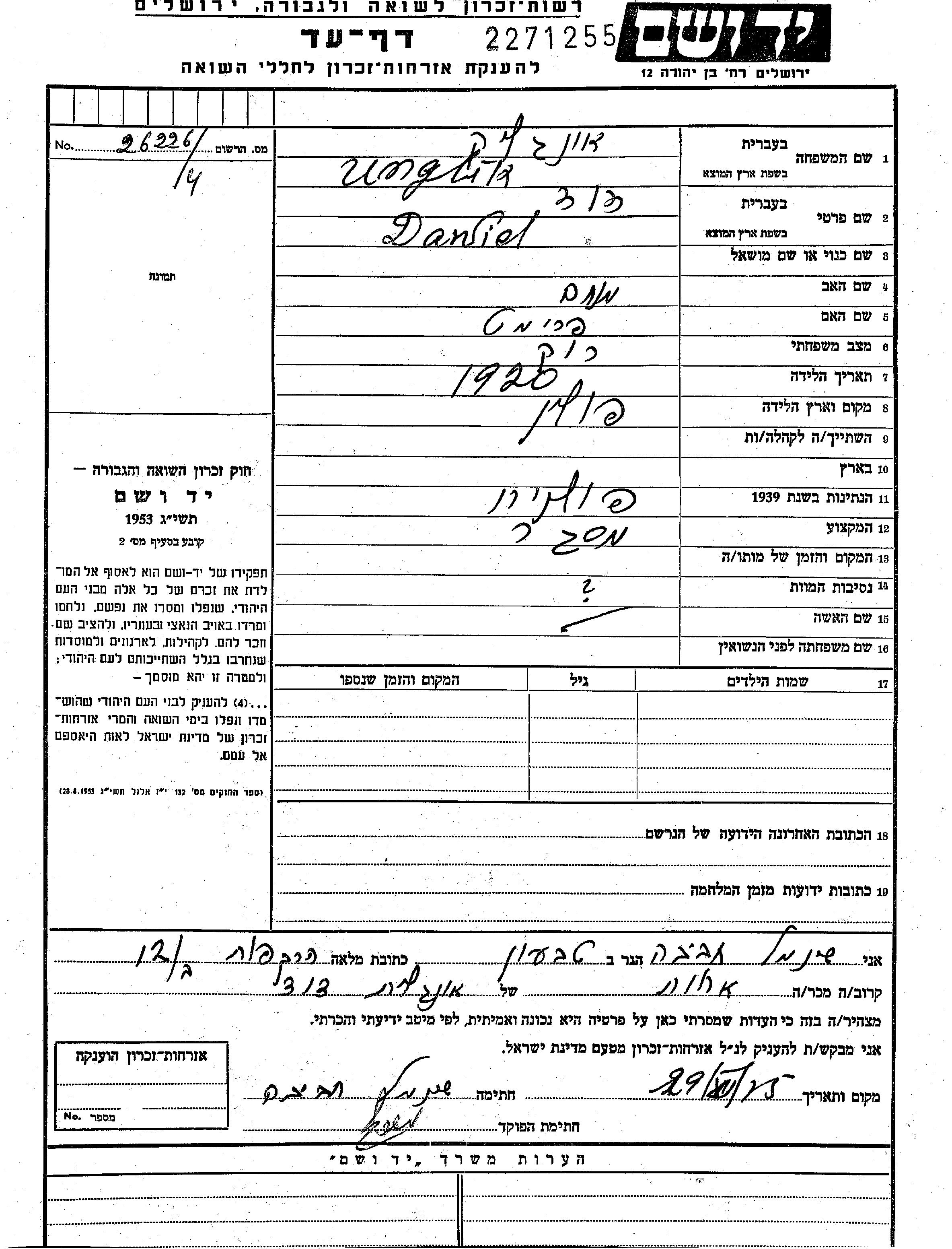 Dawid Unglik wurde im Jahr 1920 in Polen geboren. Er war der Sohn von Menakhem und Frimet. Er war Schlosser und Ledig. Vor dem Zweiten Weltkrieg lebte er in Polen. Während des Krieges war er in Polen.
