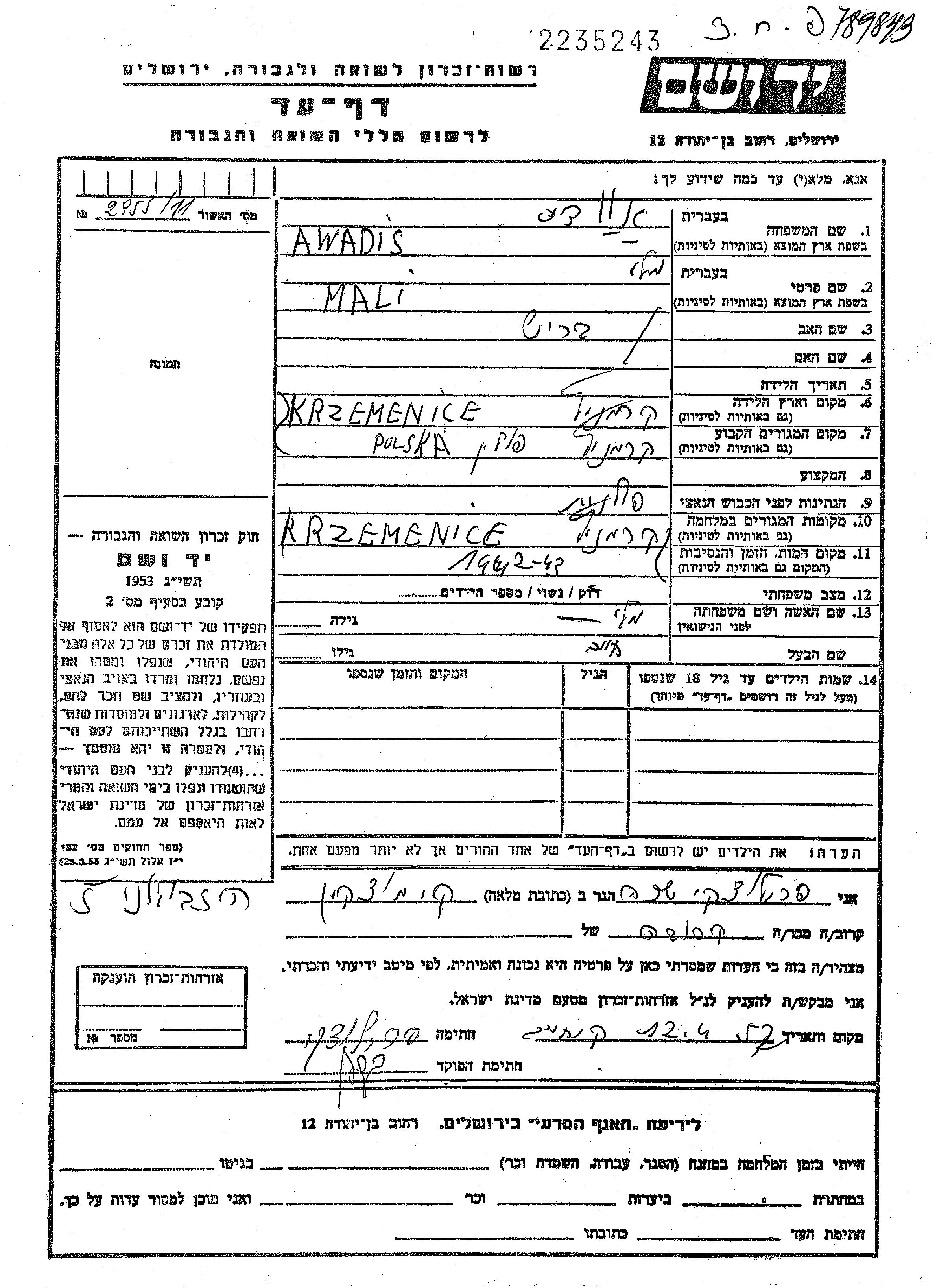 Mali Awadis wurde in Krzemieniec, Polen geboren. Sie war die Tochter von Berish. Sie war mit Chaim Verheiratet. Vor dem Zweiten Weltkrieg lebte sie in Krzemieniec, Polen. Während des Krieges war sie in Krzemieniec, Polen.