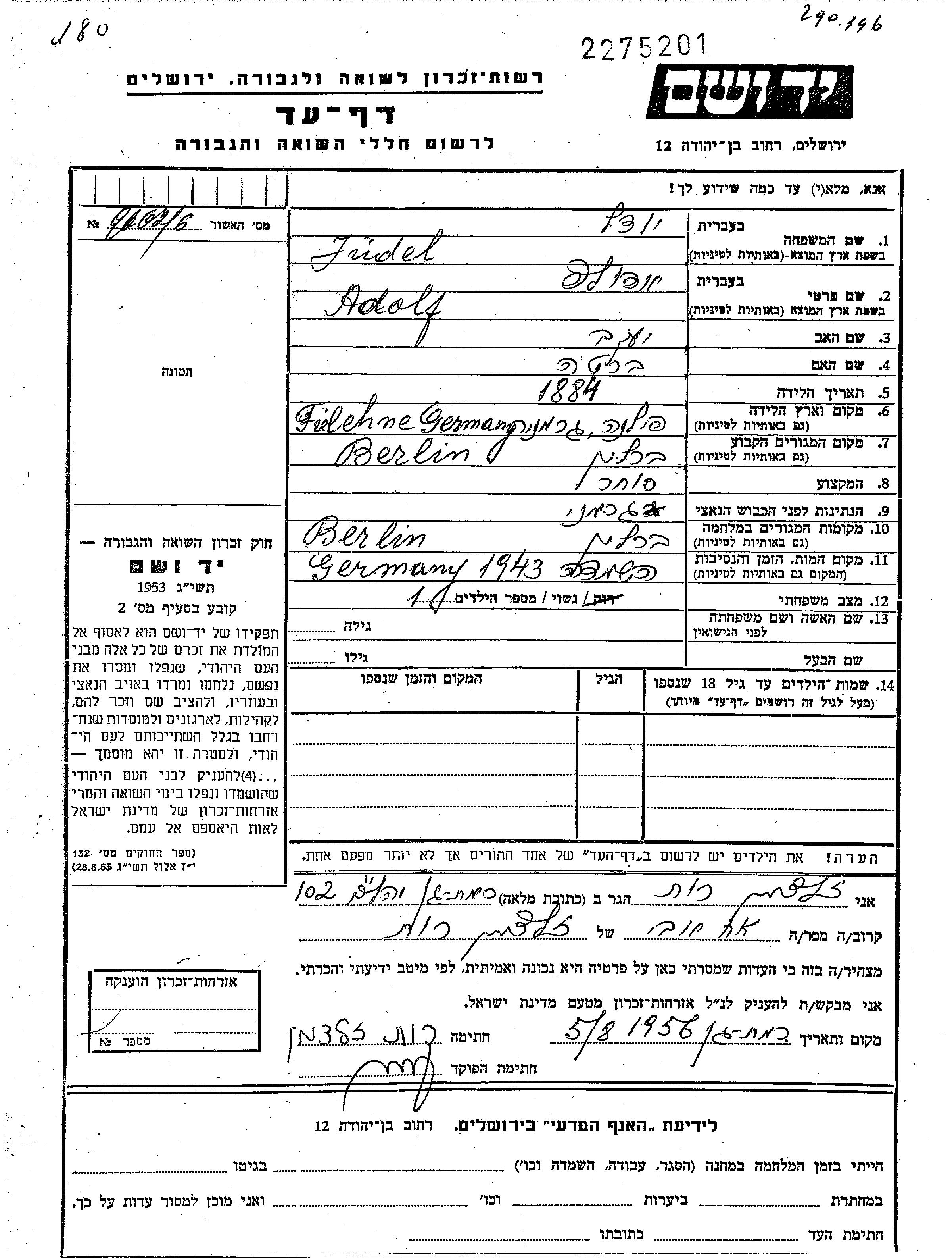 Adolf Jüdel Idel wurde im Jahr 1884 in Filehne, Deutsches Reich geboren. Er war der Sohn von Yaakov und Berta. Er war Kaufmann/-frau und Verheiratet. Vor dem Zweiten Weltkrieg lebte er in Berlin, Deutsches Reich. Während des Krieges war er in Berlin, Deutsches Reich.