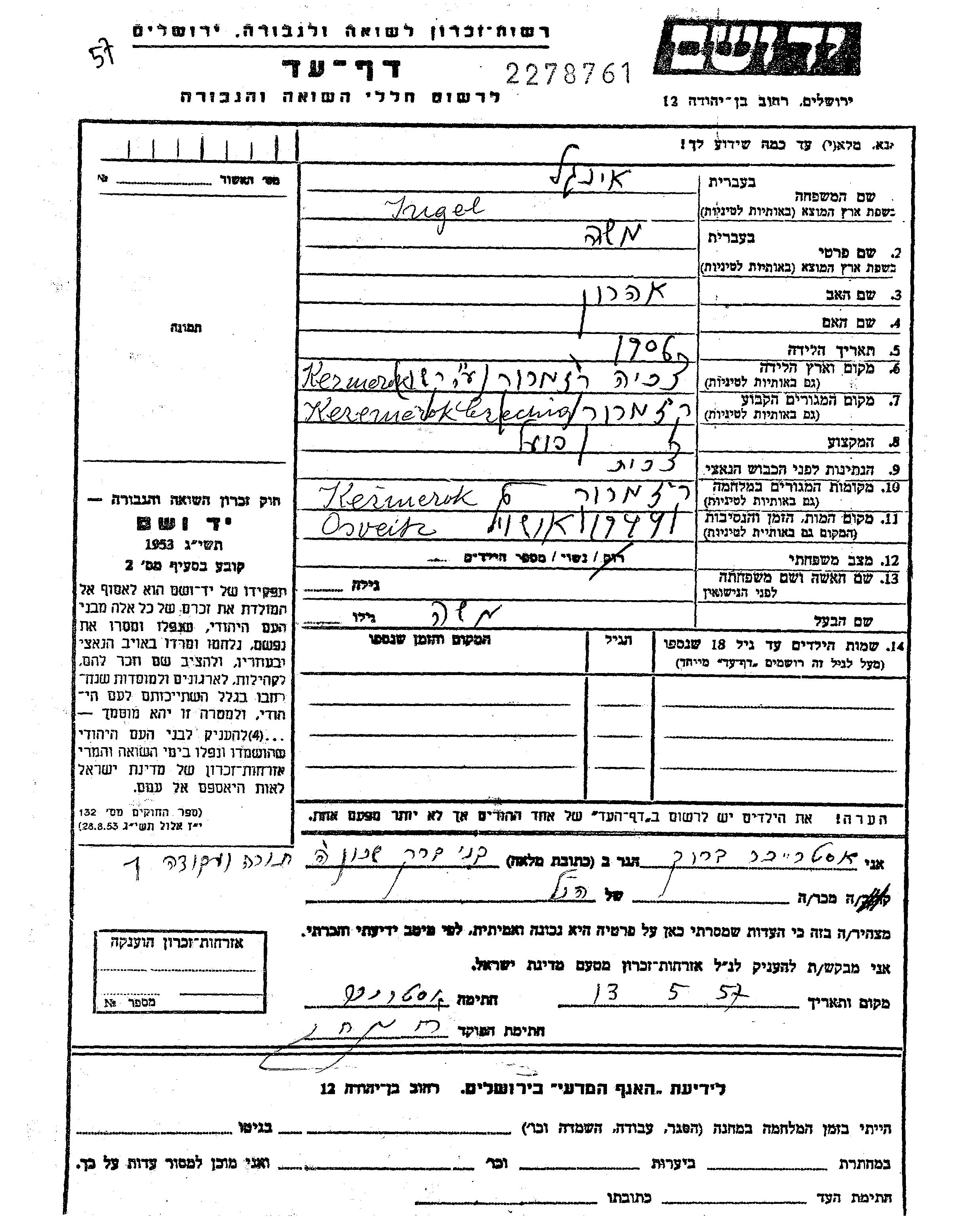 Moshe Ingel wurde im Jahr 1906 in Kesmark, Tschechoslowakei geboren. Er war der Sohn von Ahron. Er war Arbeiter/-in und Verheiratet. Vor dem Zweiten Weltkrieg lebte er in Kesmark, Tschechoslowakei. Während des Krieges war er in Kesmark, Tschechoslowakei.