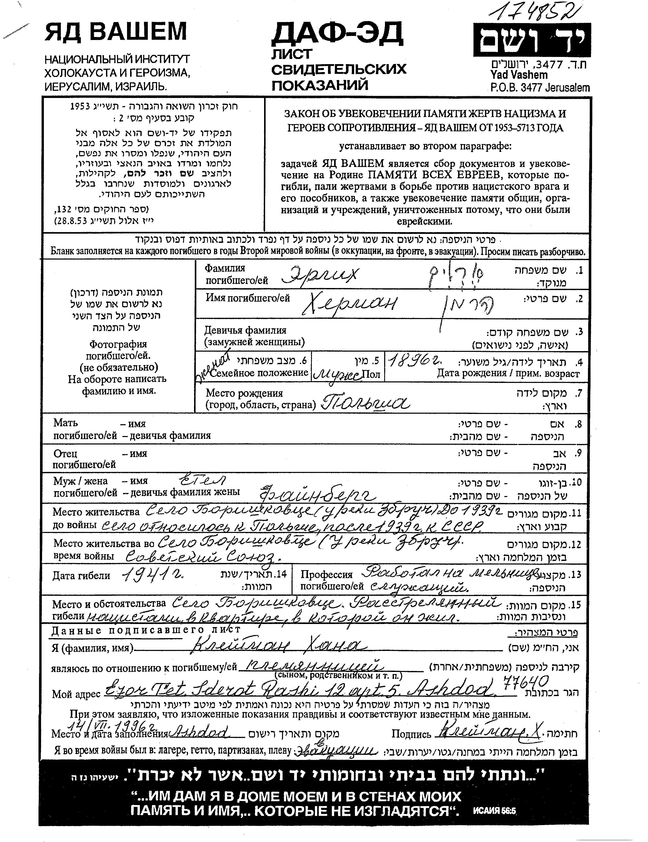 Kherman wurde in der Schoah ermordet. Todesort: Boryszkowce, Polen im Jahr 1941.