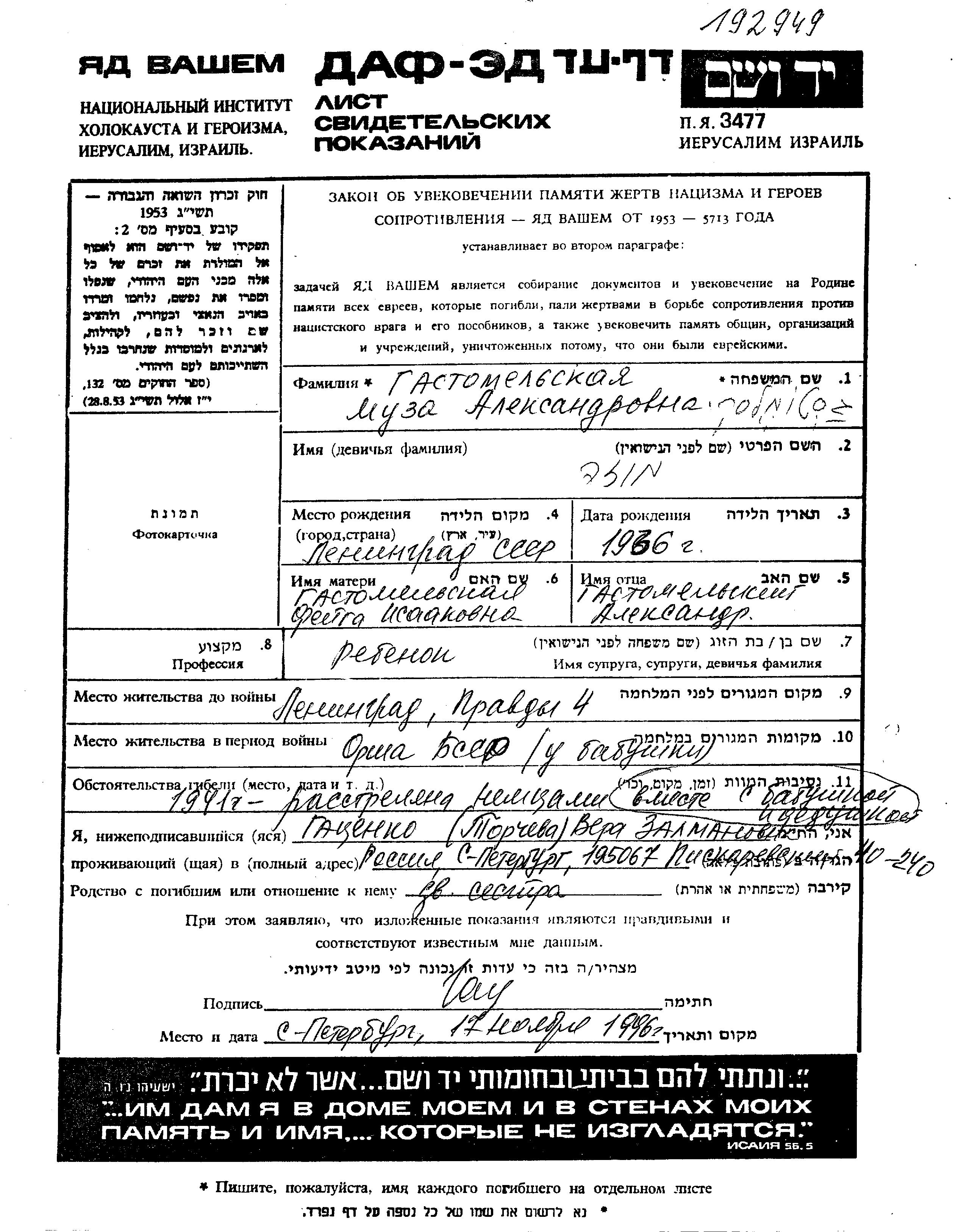 Muza Gastomelskaya wurde im Jahr 1936 in Leningrad, Russland (UdSSR) geboren. Sie war die Tochter von Aleksandr und Feiga. Sie war Kind. Vor dem Zweiten Weltkrieg lebte sie in Leningrad, Russland (UdSSR). Während des Krieges war sie in Orsha, Weißrussland (UdSSR).