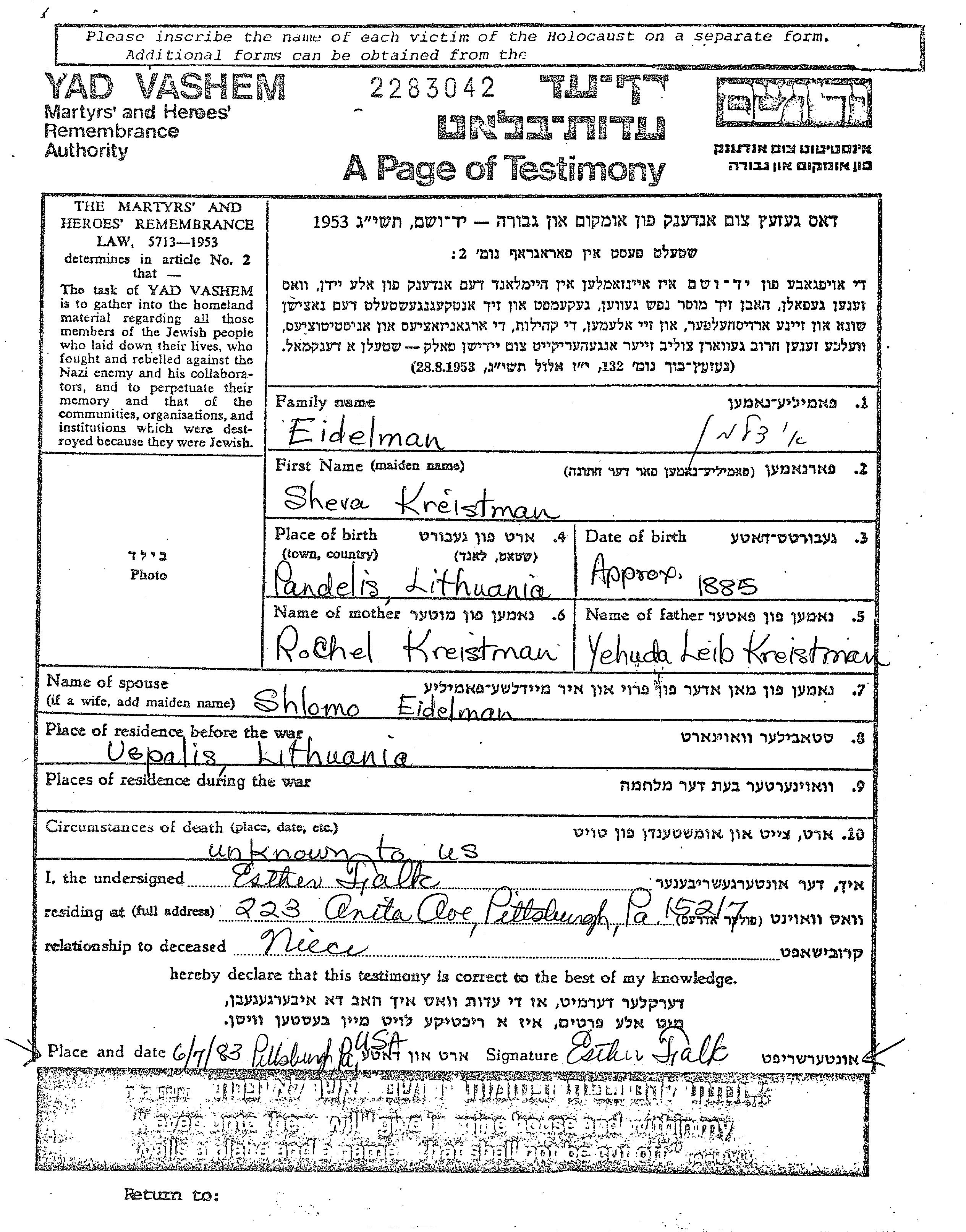 Sheva Eidelman Idelman, geb. Kreistman wurde im Jahr 1885 in Pandelys, Litauen geboren. Sie war die Tochter von Yehuda Leib und Rochel. Sie war mit Shlomo Verheiratet. Vor dem Zweiten Weltkrieg lebte sie in Uzpalis, Litauen.