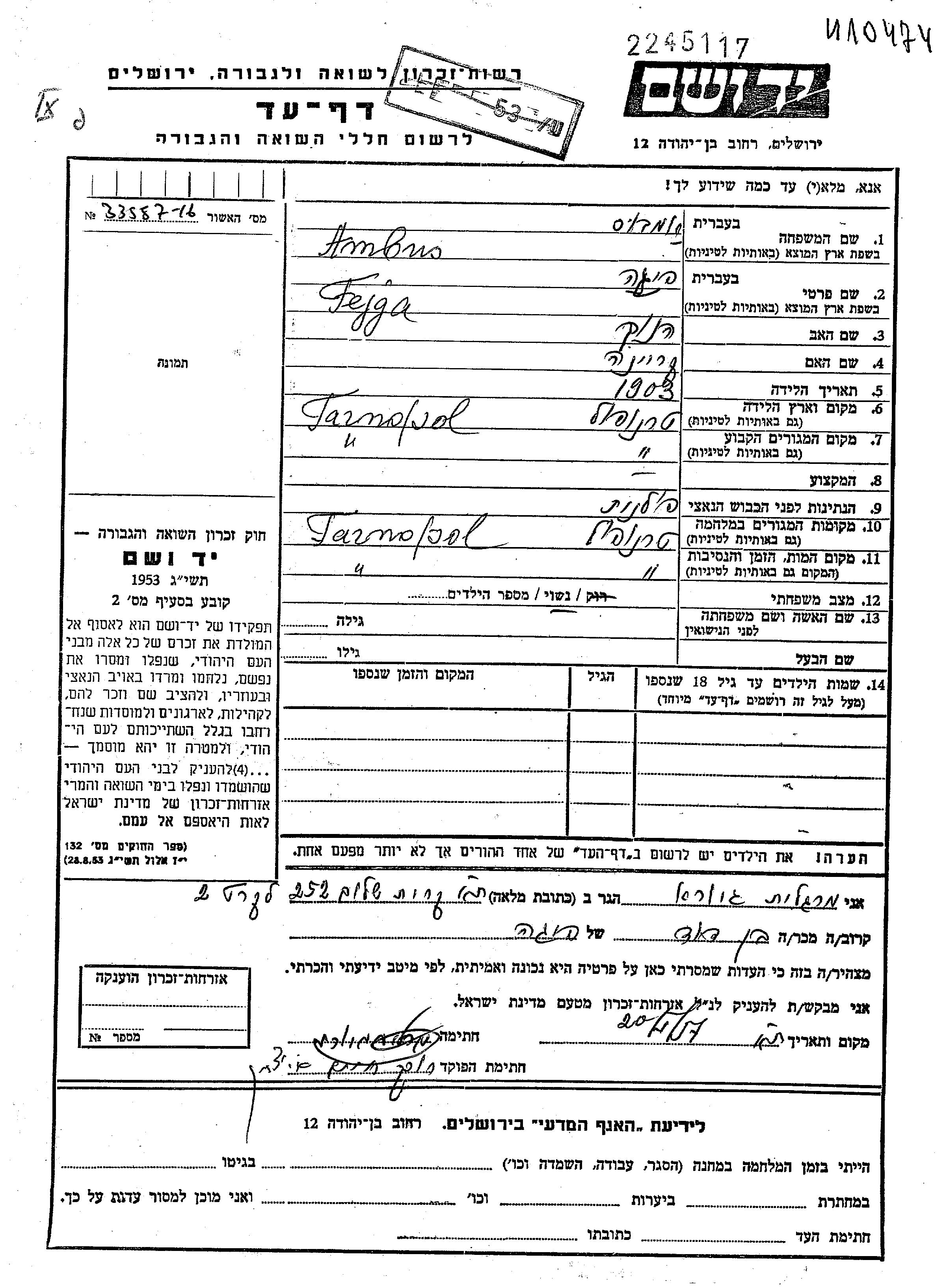 Fejga Ambus wurde im Jahr 1903 in Tarnopol, Polen geboren. Sie war die Tochter von Heniek und Craine. Sie war Verheiratet. Vor dem Zweiten Weltkrieg lebte sie in Tarnopol, Polen. Während des Krieges war sie in Tarnopol, Polen.