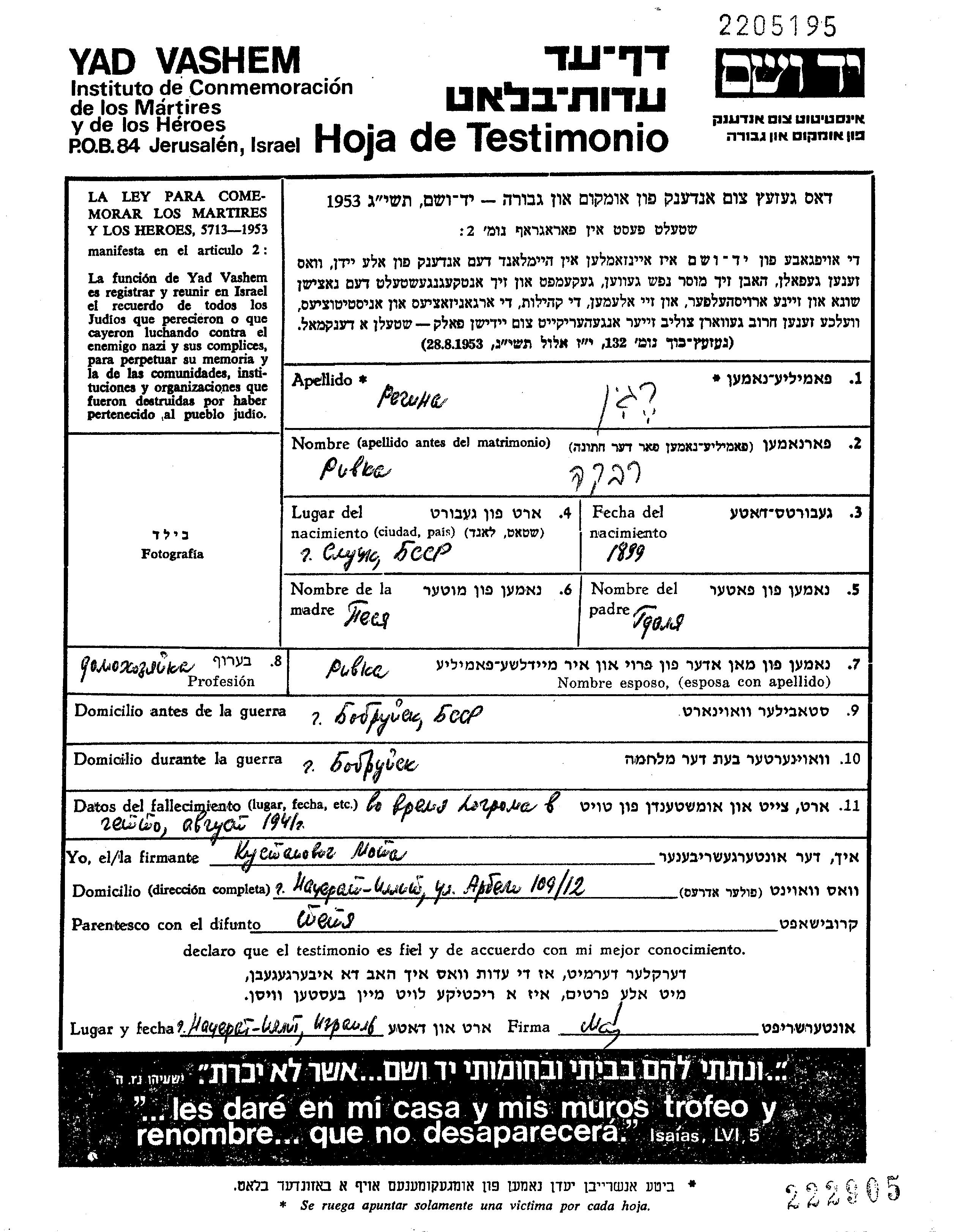 Regin Rivka 1899 Bobruysk, Weißrussland (UdSSR) Gedenkblatt