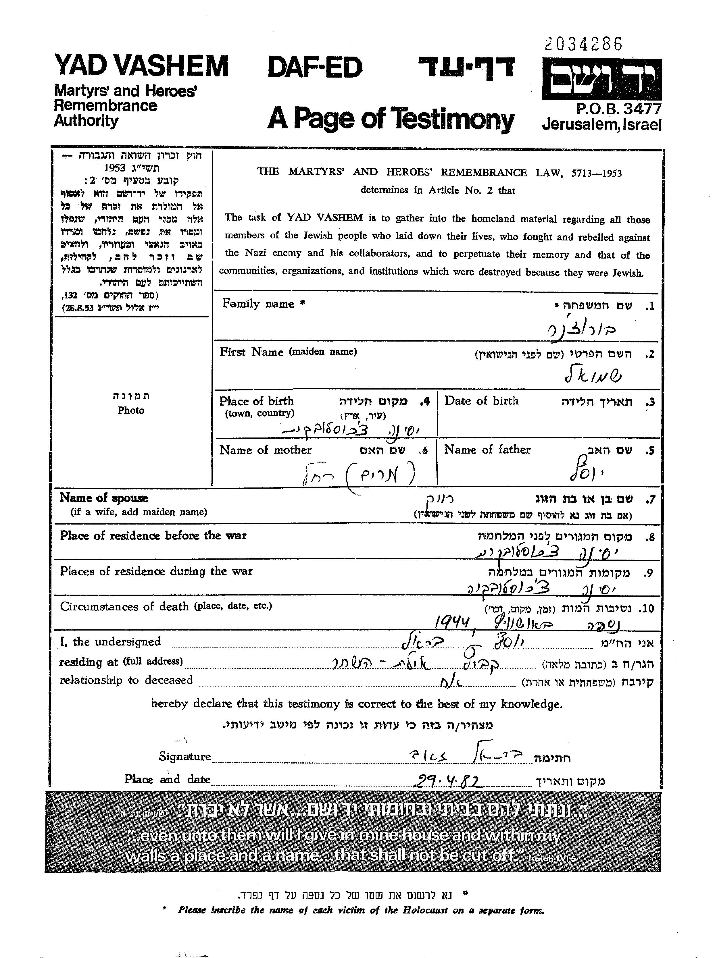 Shmuel wurde in der Schoah ermordet. Todesort: Auschwitz, Polen im Jahr 1944.