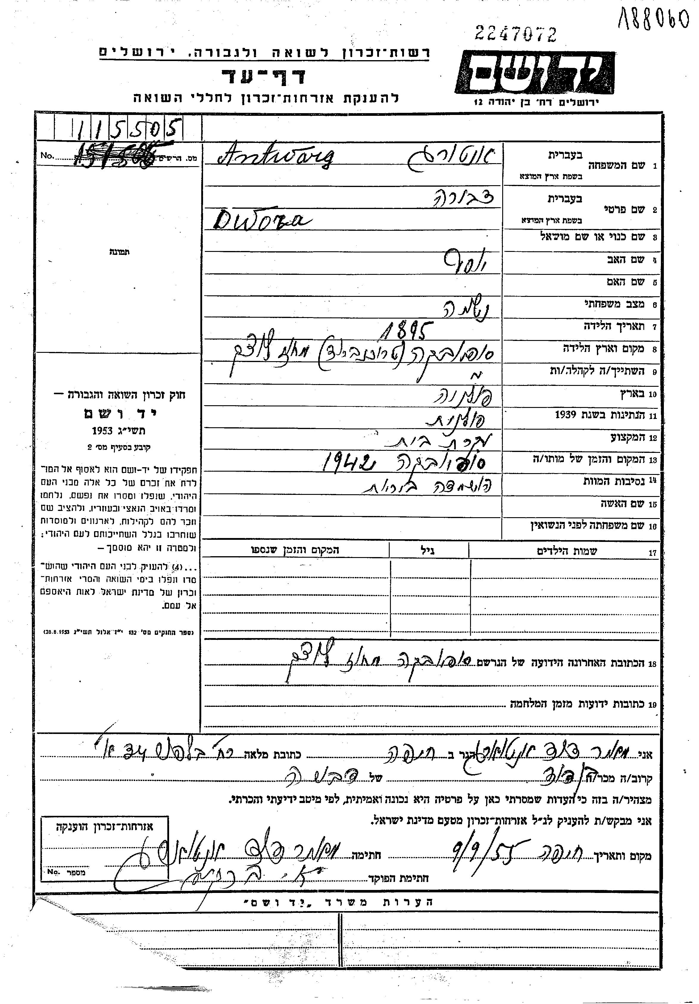 Dwora wurde in der Schoah ermordet. Todesort: Zofjówka, Polen im Jahr 1942.