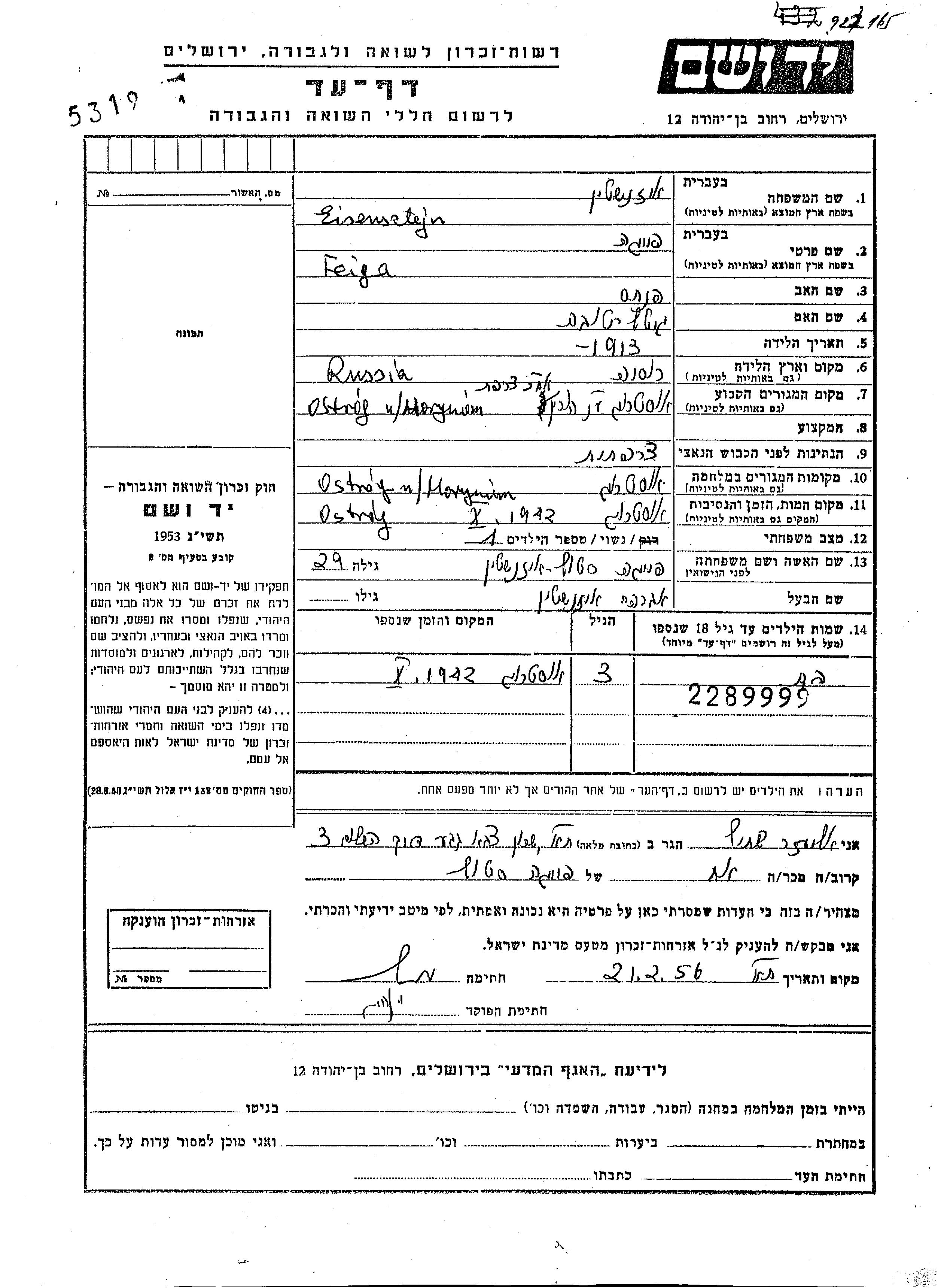 Eisensztejn Vorname unbekannt 1939 unbekannter Ort, Gedenkblatt