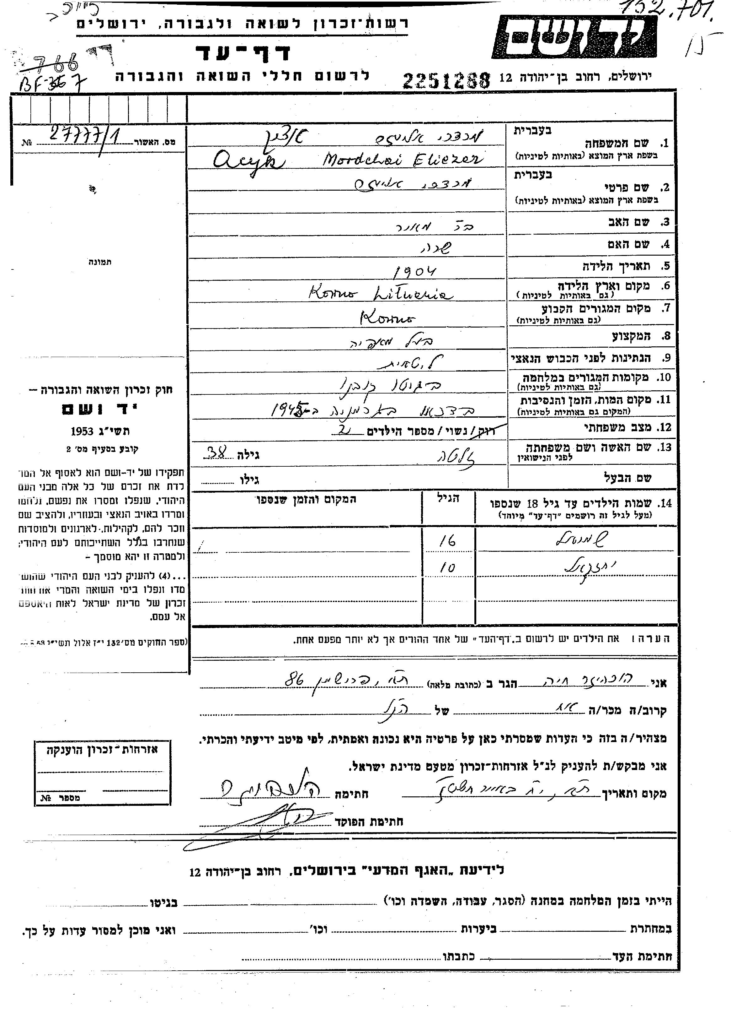 Mordekhai Eliezer wurde in der Schoah ermordet. Todesort: unbekannt im Jahr 1945.