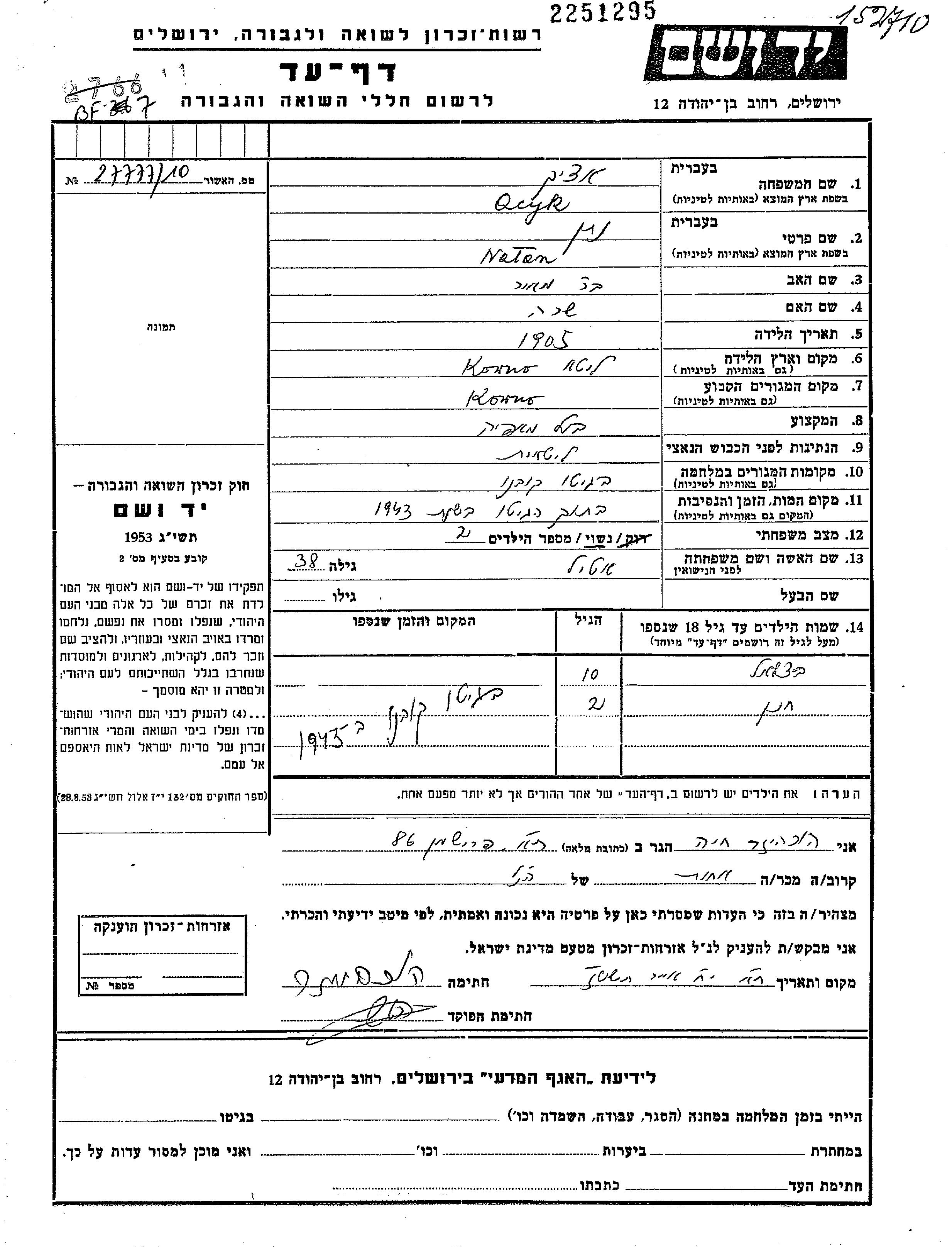 Natan wurde in der Schoah ermordet. Todesort: Kowno, Litauen im Jahr 1943.