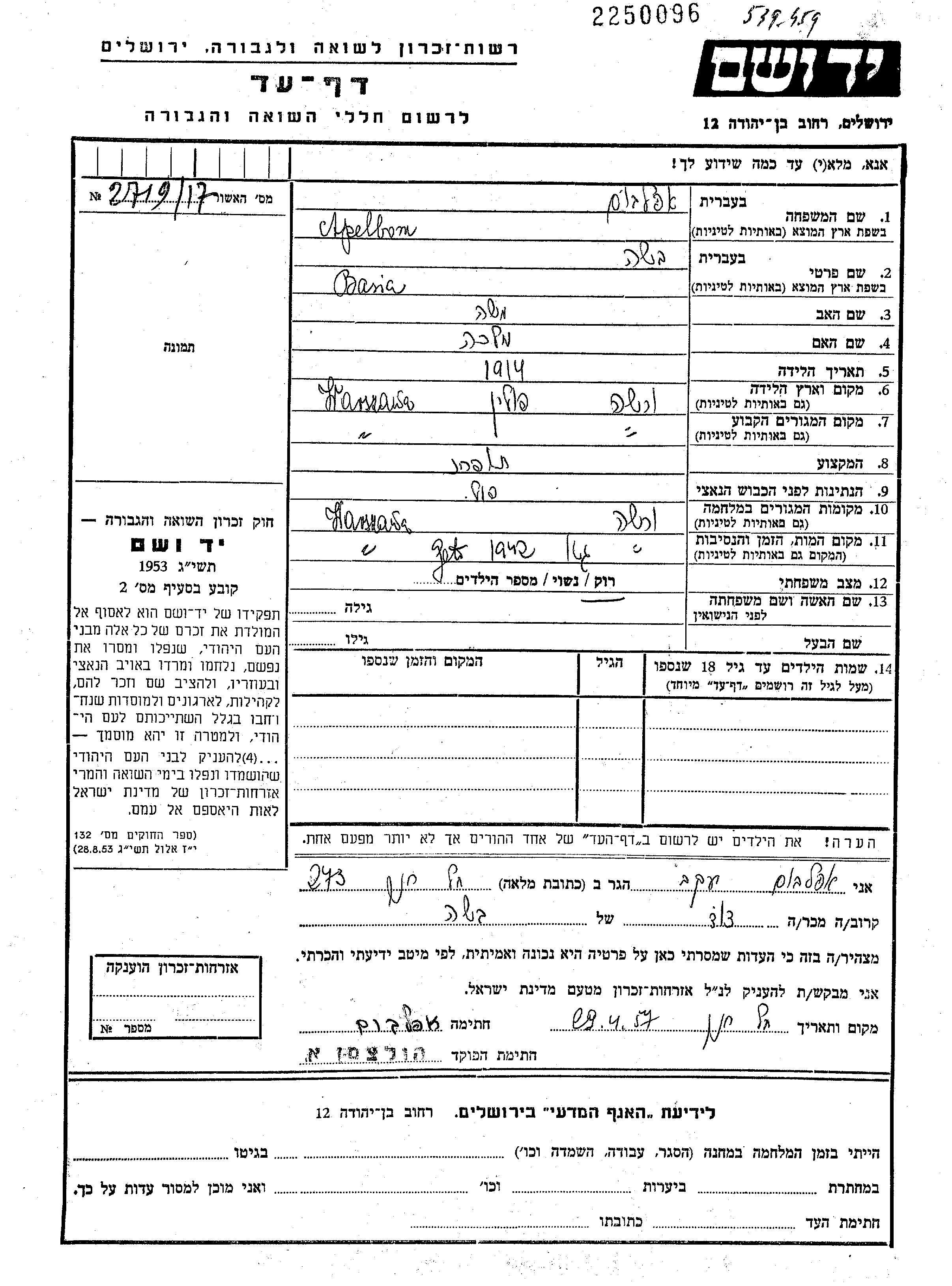 Basha Apelbom wurde im Jahr 1914 in Warszawa, Polen geboren. Sie war die Tochter von Mosze und Malka. Sie war Schneiderin und Ledig. Vor dem Zweiten Weltkrieg lebte sie in Warszawa, Polen. Während des Krieges war sie in Warszawa, Polen.