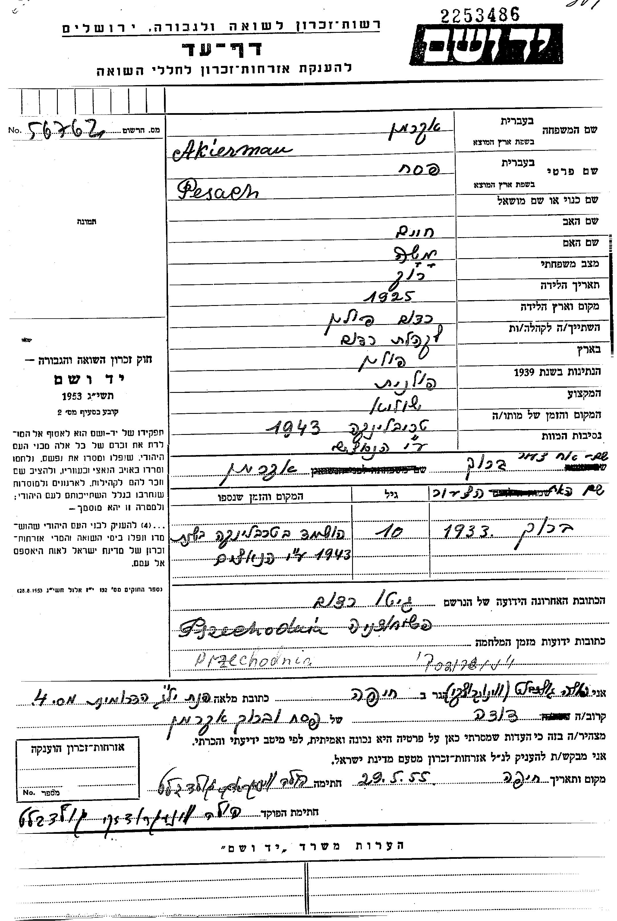 Pesach Akierman wurde im Jahr 1925 in Radom, Polen geboren. Er war der Sohn von Khaim und Masha. Er war Rentner/-in und Ledig. Vor dem Zweiten Weltkrieg lebte er in Radom, Polen. Während des Krieges war er in Radom, Polen.