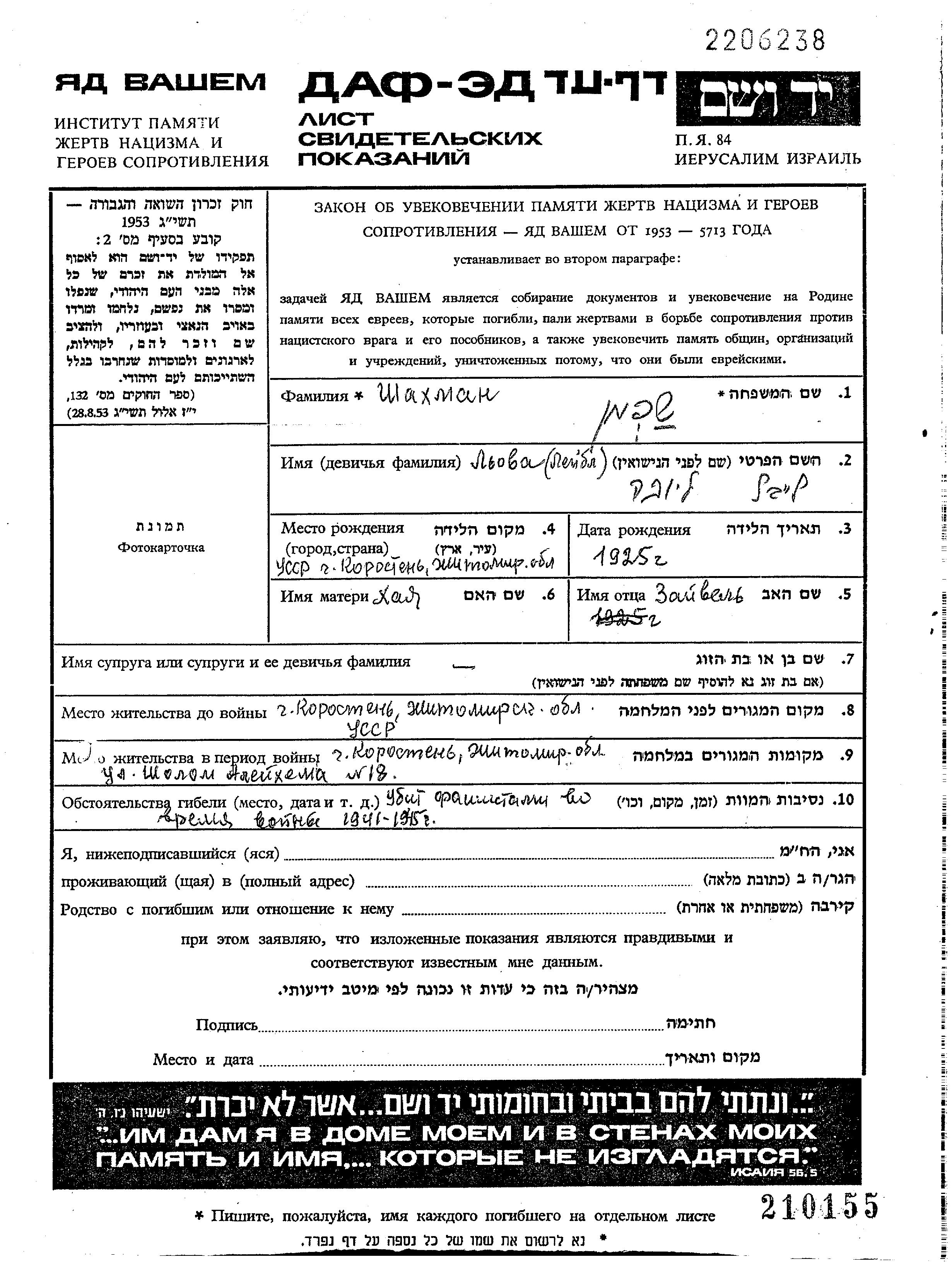 Sachman Ljuba Leibl 1925 Korosten, Ukraine (UdSSR) Gedenkblatt