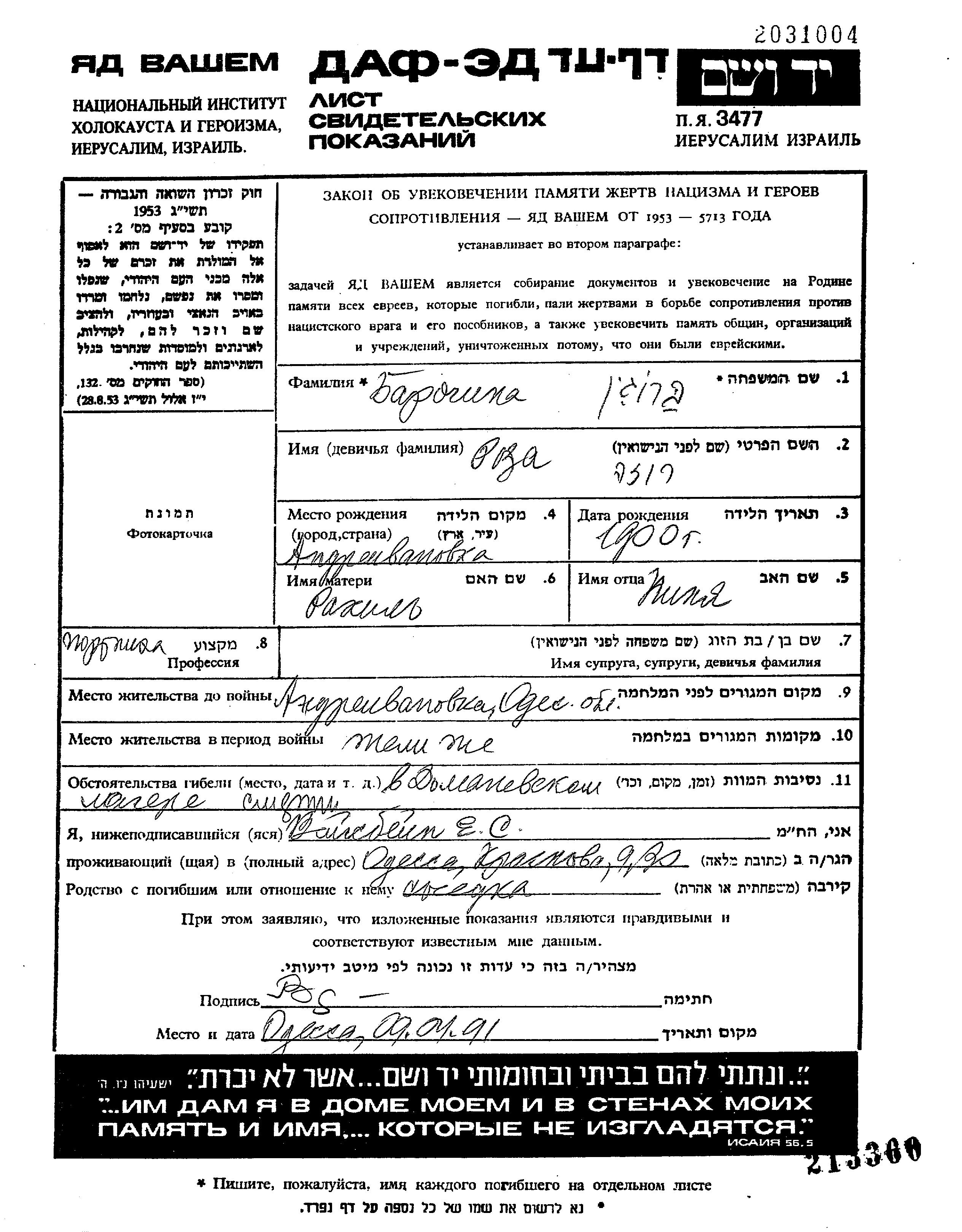 Roza Barogin wurde im Jahr 1900 in Andreyevo Ivanovka, Ukraine (UdSSR) geboren. Sie war die Tochter von Pinkhas und Rakhil. Sie war Schneiderin. Vor dem Zweiten Weltkrieg lebte sie in Andreyevo Ivanovka, Ukraine (UdSSR). Während des Krieges war sie in Andreyevo Ivanovka, Ukraine (UdSSR).