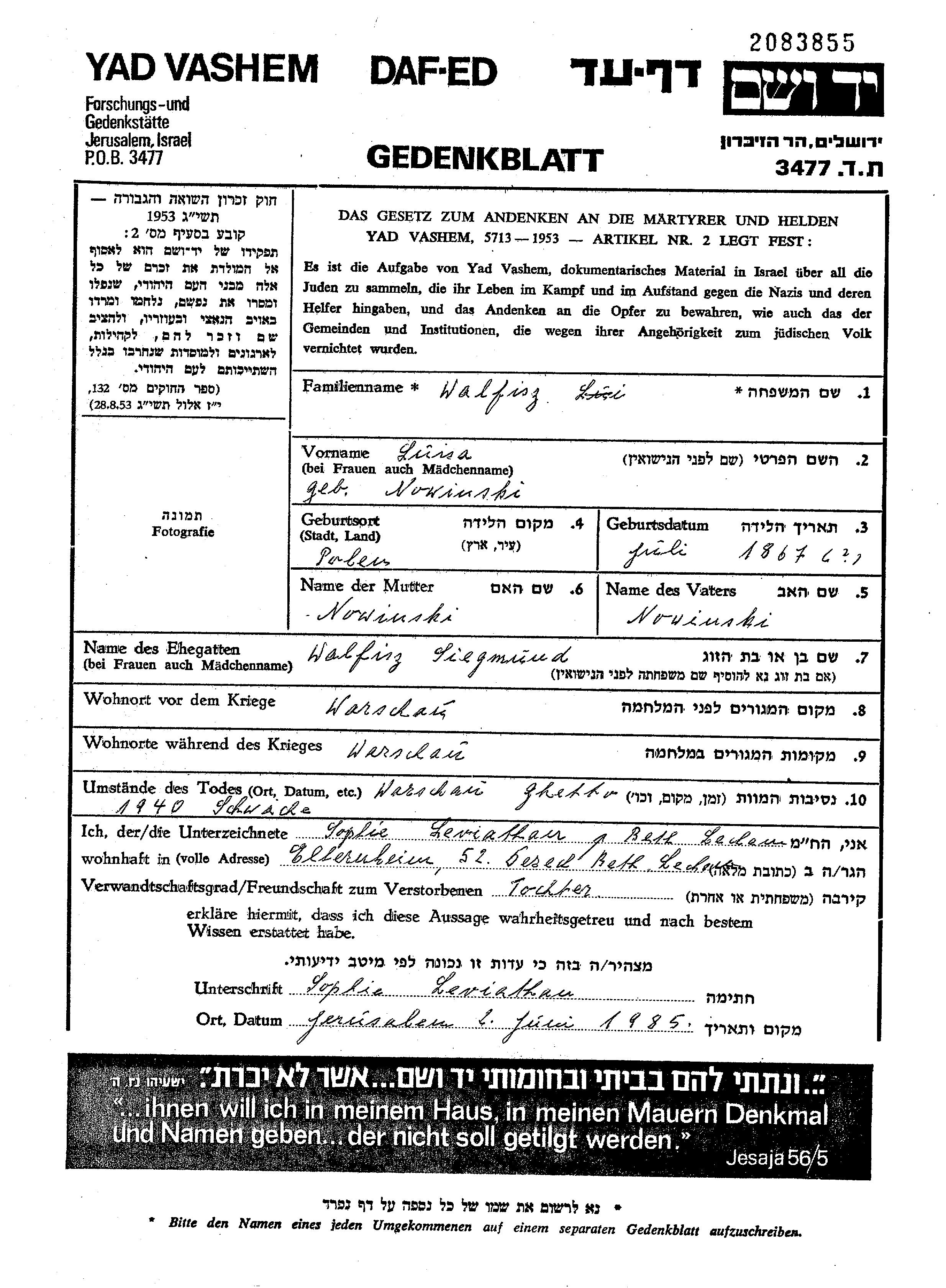 Luisa Walfisz, geb. Nowinski wurde im Jahr 1867 in Polen geboren. Sie war mit Siegmund Verheiratet. Vor dem Zweiten Weltkrieg lebte sie in Warszawa, Polen. Während des Krieges war sie in Warszawa, Polen.
