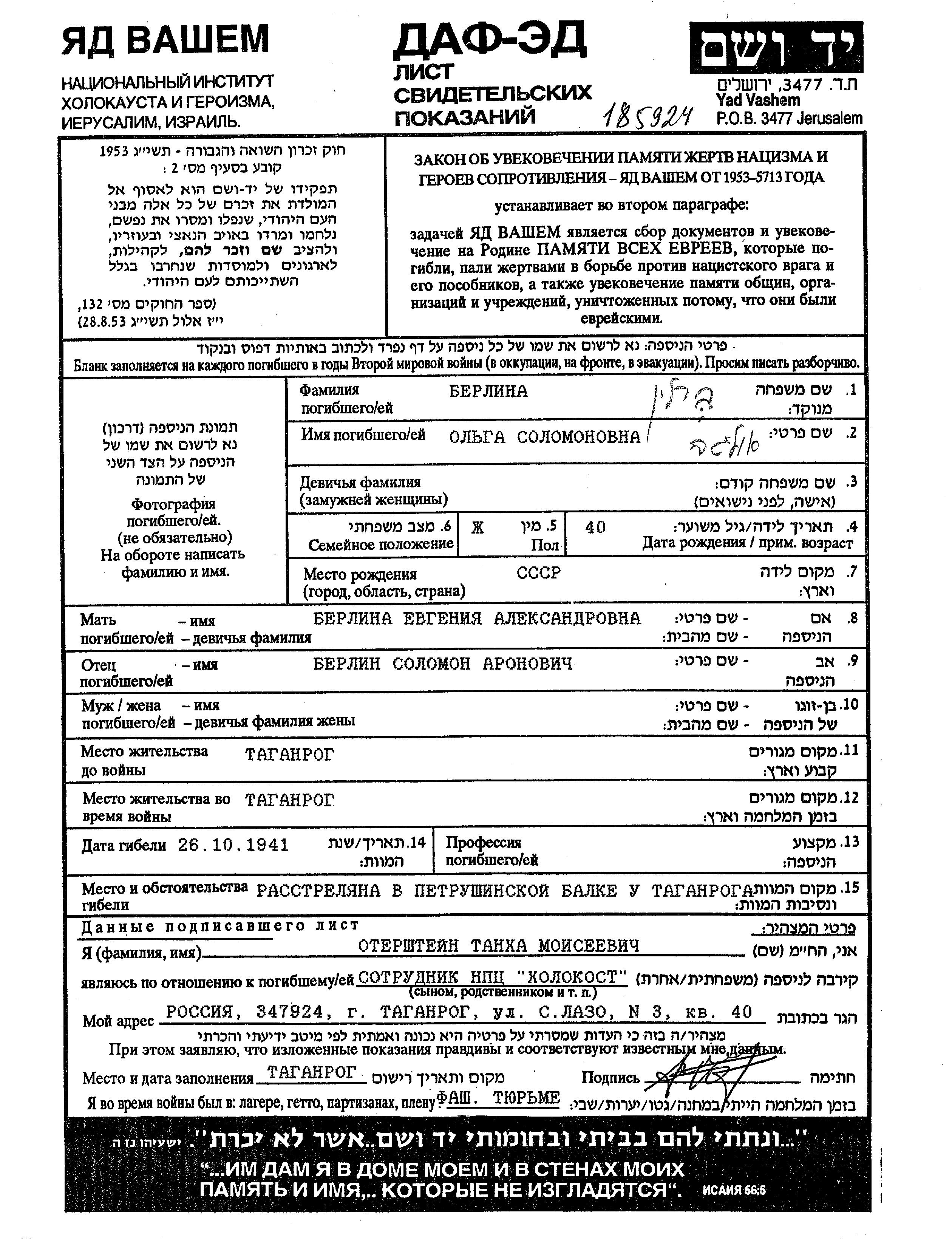 Olga Berlin wurde im Jahr 1901 in Sowjetunion geboren. Sie war die Tochter von Solomon und Yevgeniya. Vor dem Zweiten Weltkrieg lebte sie in Taganrog, Russland (UdSSR). Während des Krieges war sie in Taganrog, Russland (UdSSR).