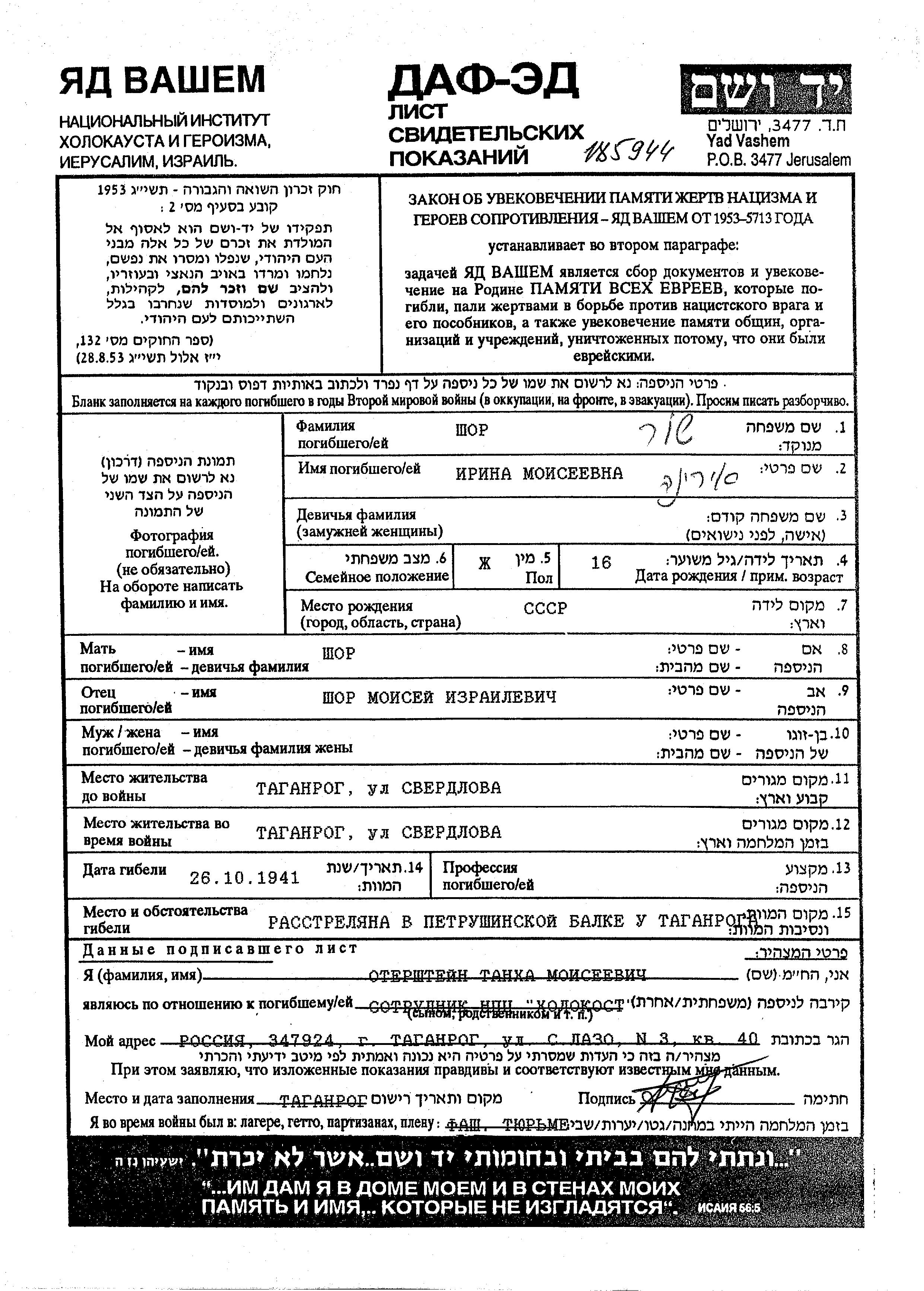 Irina wurde in der Schoah ermordet. Todesort: Taganrog, Russland (UdSSR) im Jahr 26/10/1941.