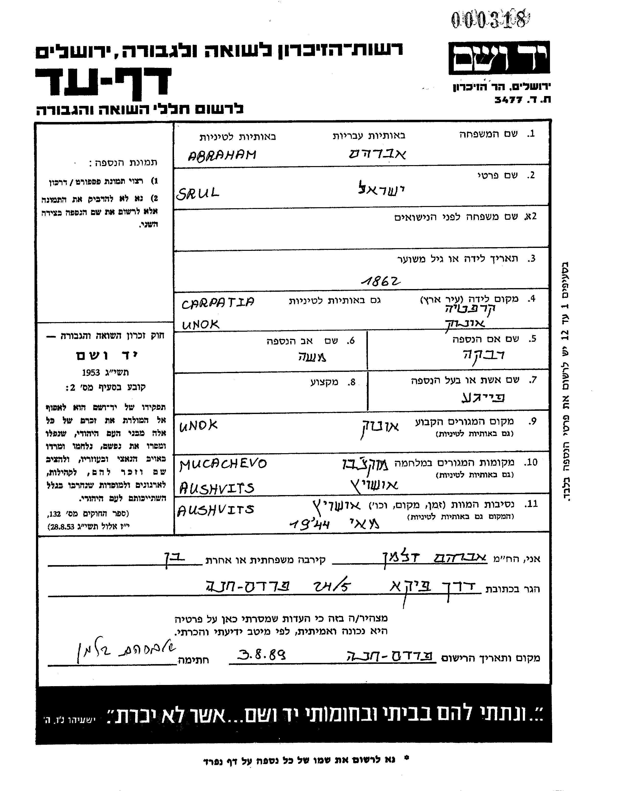 Srul Abraham wurde im Jahr 1862 in Onok, Tschechoslowakei geboren. Er war der Sohn von Moshe und Rivka. Er war mit Feige Verheiratet. Vor dem Zweiten Weltkrieg lebte er in Onok, Tschechoslowakei. Während des Krieges war er in Mukacevo, Tschechoslowakei.