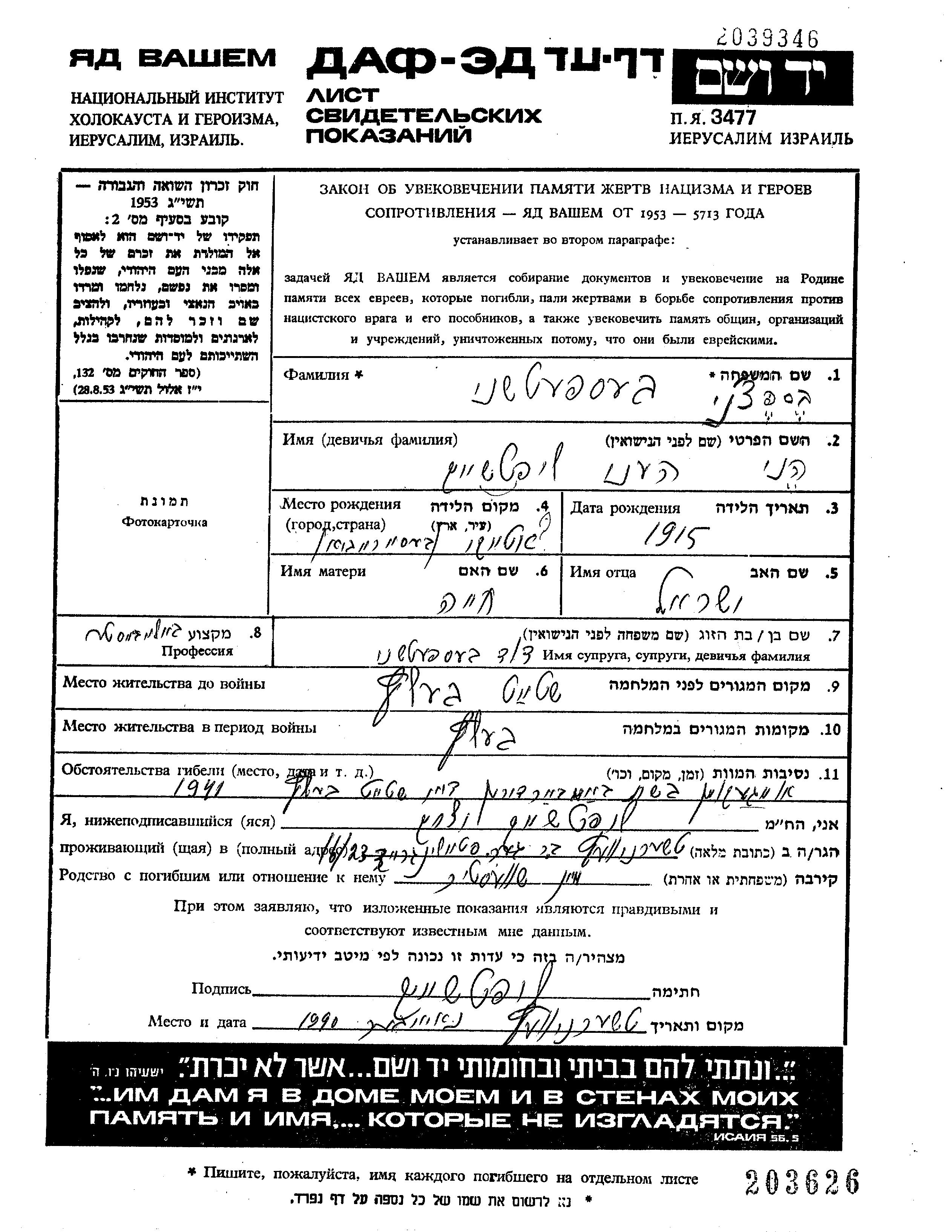 Henny Heni Bespechni, geb. Lipchak wurde im Jahr 1915 in Atachi, Rumänien geboren. Sie war die Tochter von Israel und Khaia. Sie war Buchhalter/-in und mit David Verheiratet. Vor dem Zweiten Weltkrieg lebte sie in Balti, Rumänien. Während des Krieges war sie in Balti, Rumänien.