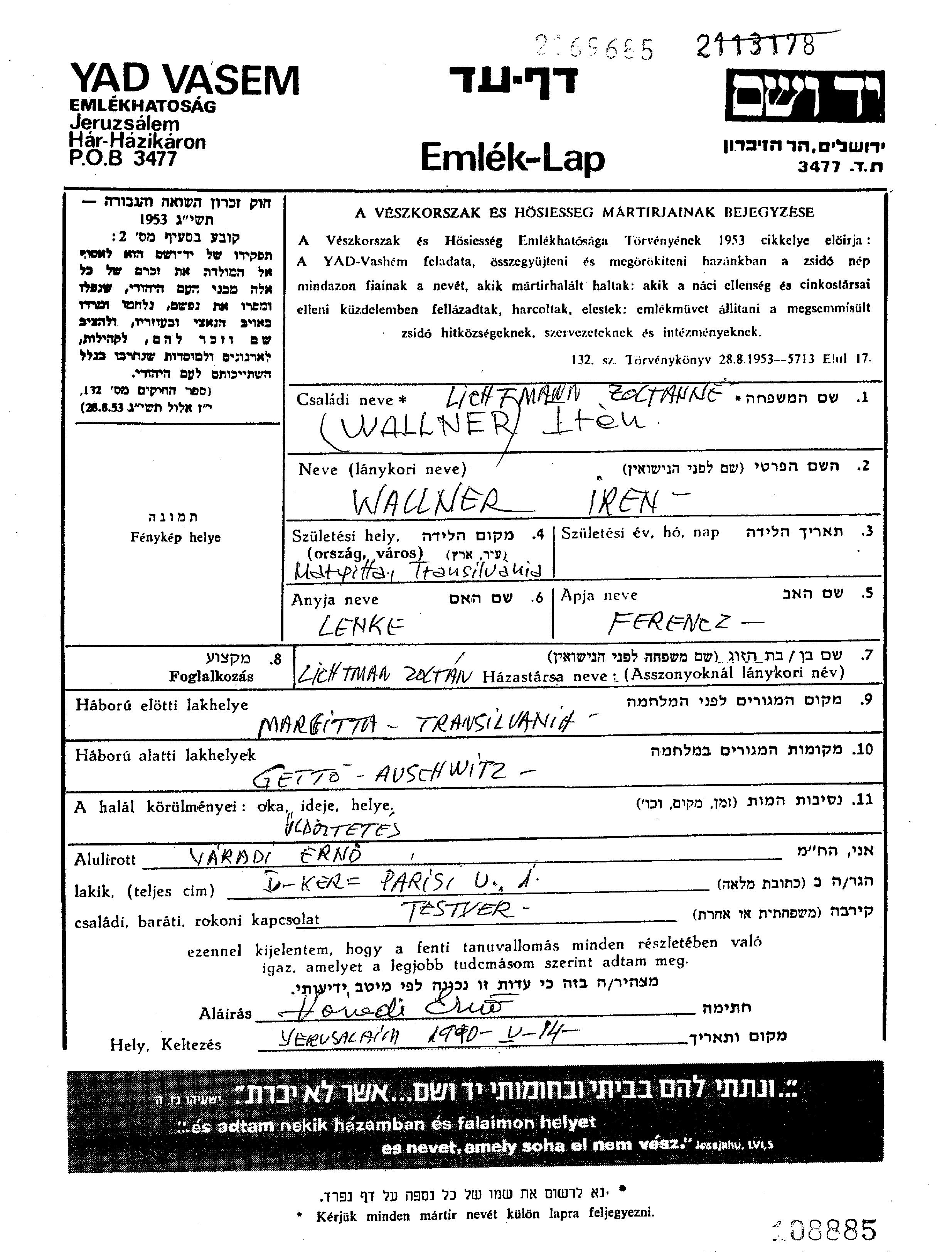 Iren Lichtmann, geb. Wallner wurde in Margita, Rumänien geboren. Sie war die Tochter von Ferencz und Lenke. Sie war mit Zoltan Verheiratet. Vor dem Zweiten Weltkrieg lebte sie in Margita, Rumänien.