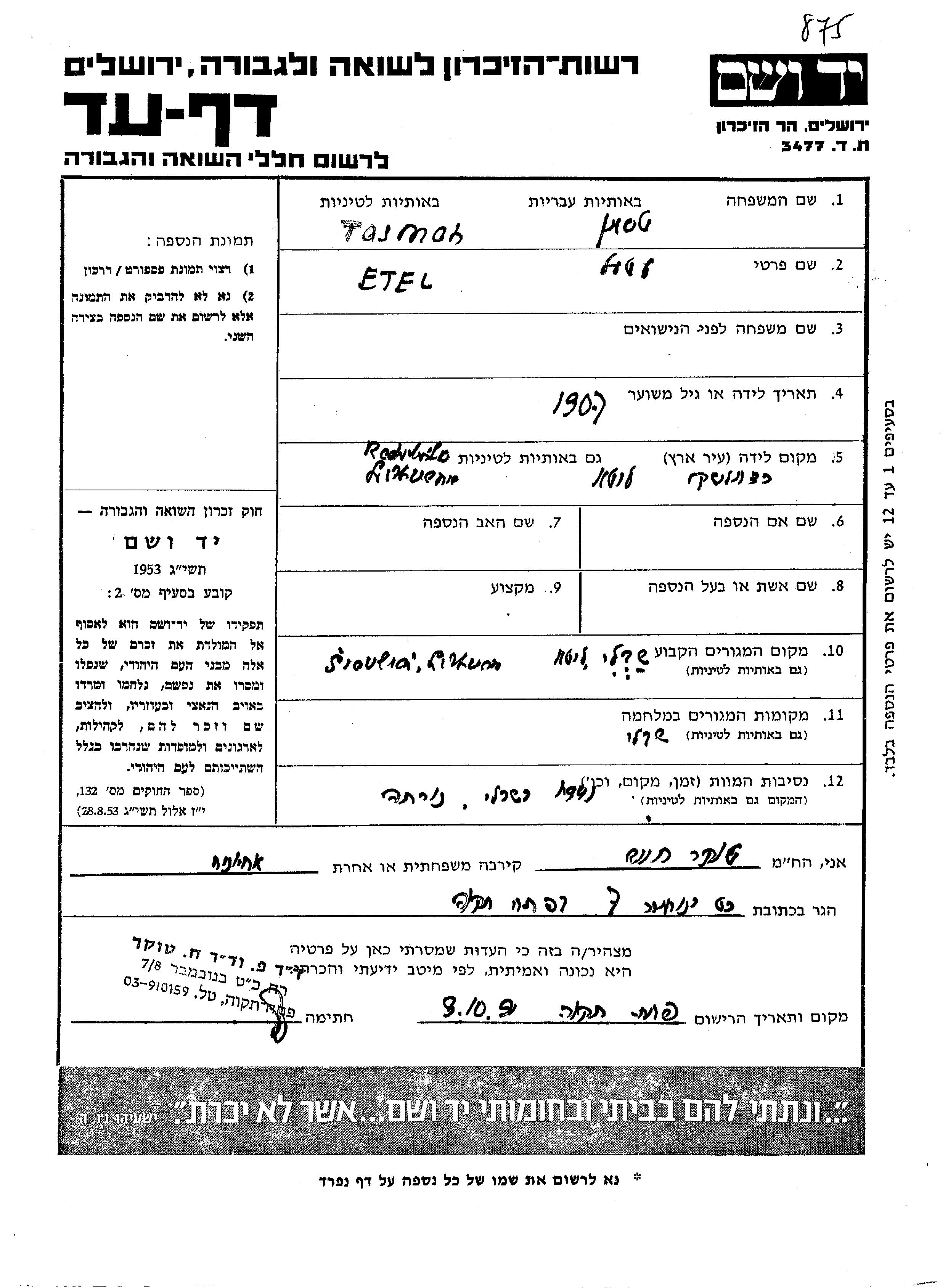 Etel wurde in der Schoah ermordet. Todesort: Siauliai, Litauen im Jahr 1941.