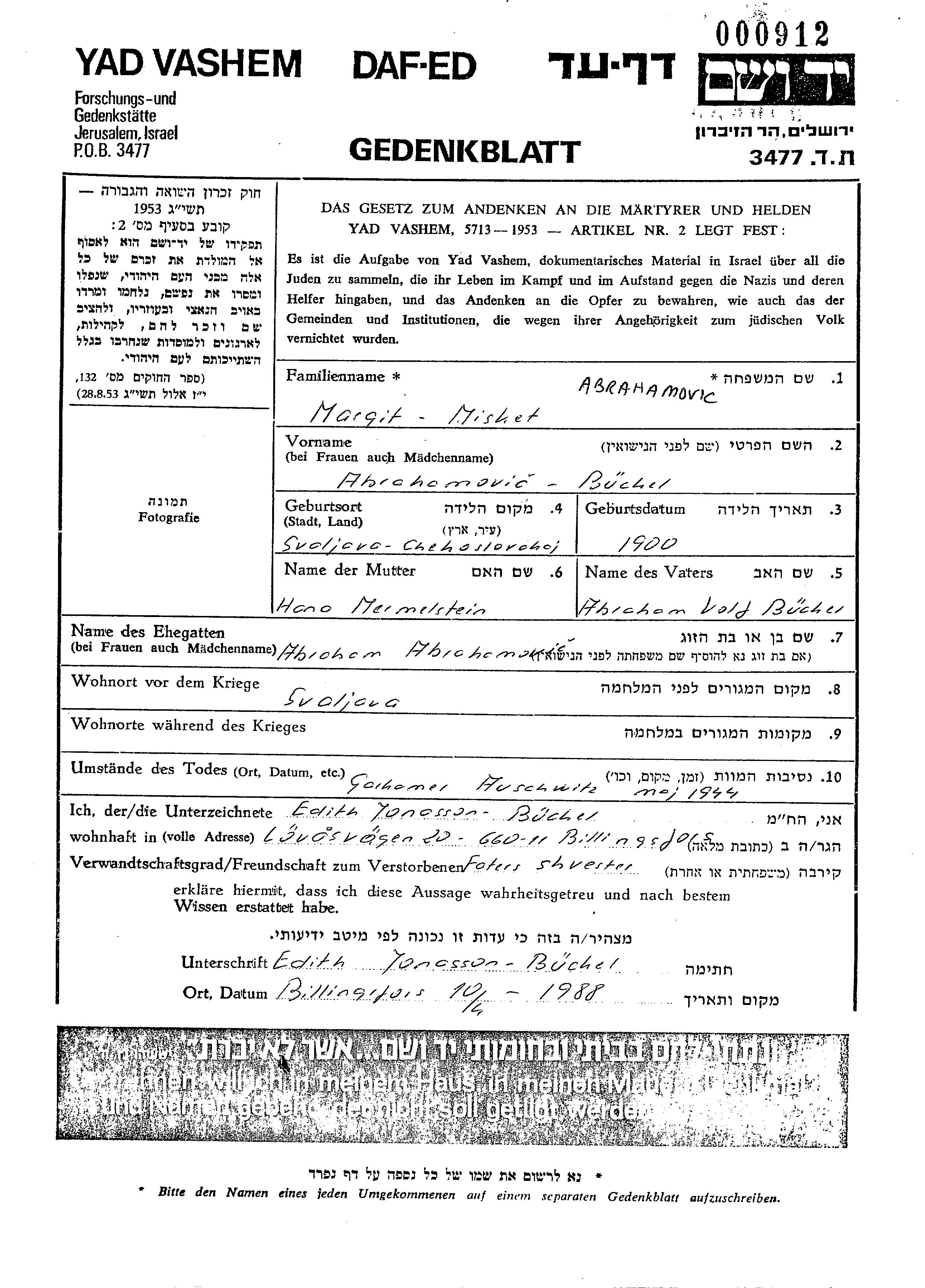 Abrahamovitz Margit 1900 Svalava, Tschechoslowakei Gedenkblatt