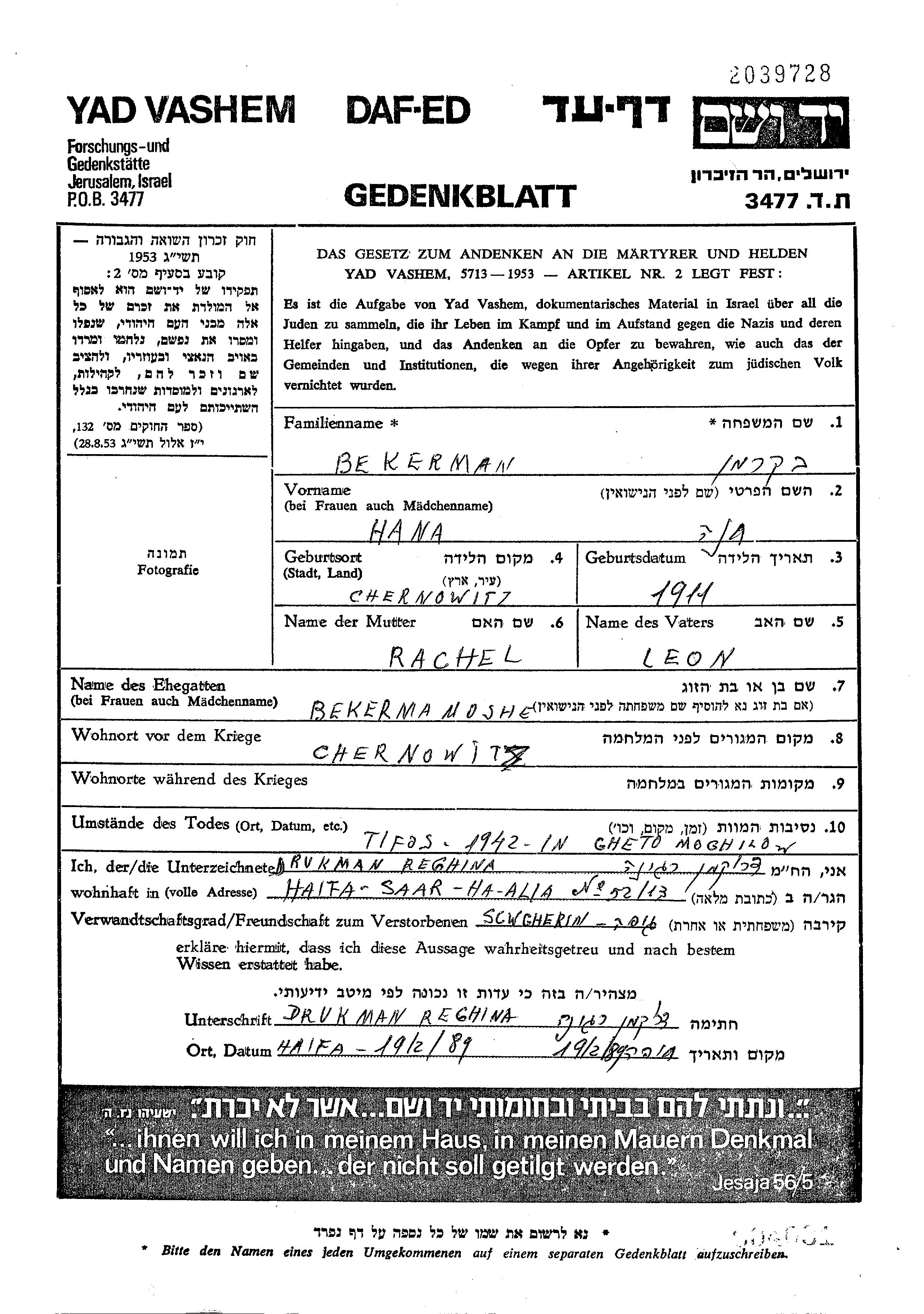 Khana Bekerman, geb. Weisman wurde im Jahr 1911 in Czernowitz, Rumänien geboren. Sie war die Tochter von Leon und Rachel. Sie war mit Moshe Verheiratet. Vor dem Zweiten Weltkrieg lebte sie in Czernowitz, Rumänien.