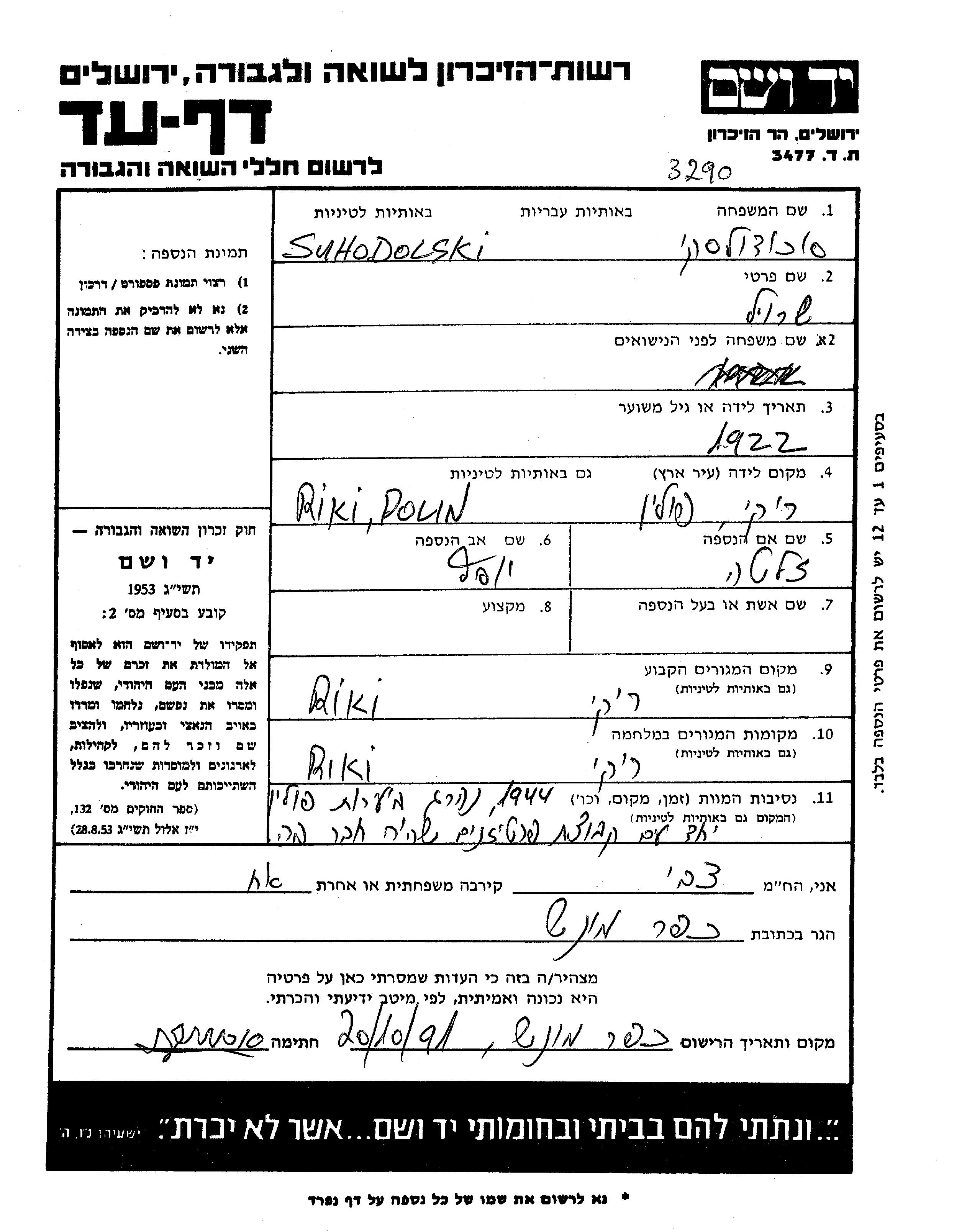 Srul Suhodolski wurde im Jahr 1922 in Ryki, Polen geboren. Er war der Sohn von Yosef und Zlate, geb. Kalina. Vor dem Zweiten Weltkrieg lebte er in Ryki, Polen. Während des Krieges war er in Ryki, Polen.
