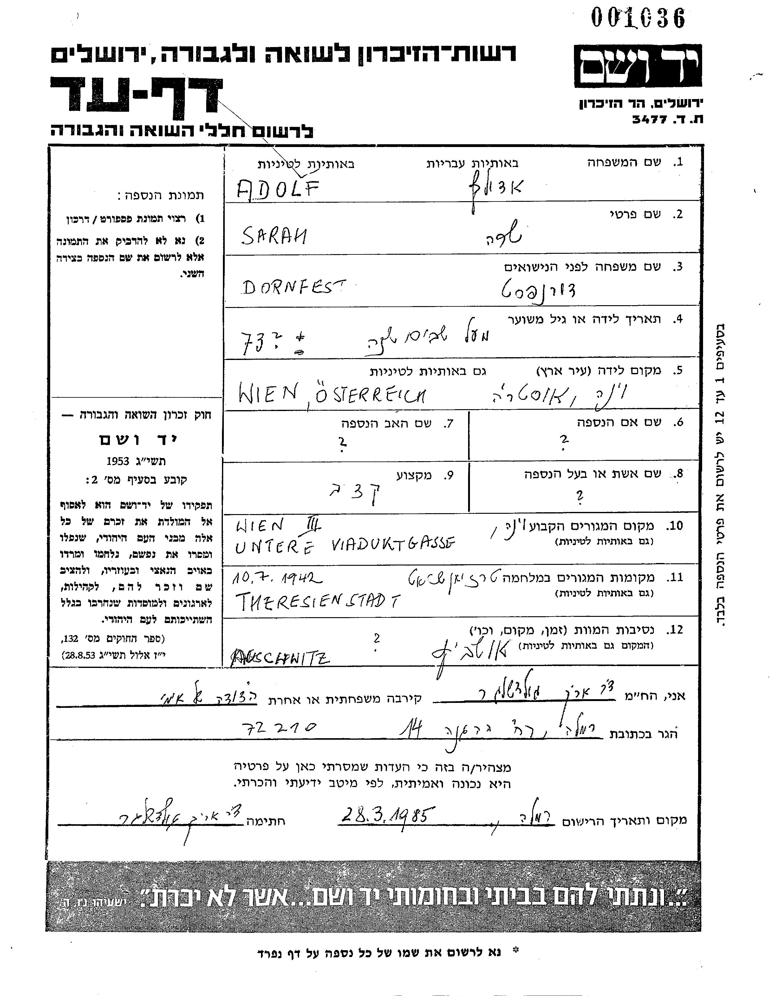 Sarah Adolf, geb. Dornfest wurde im Jahr 1869 in Wien, Österreich geboren. Sie war Verheiratet. Vor dem Zweiten Weltkrieg lebte sie in Wien, Österreich.