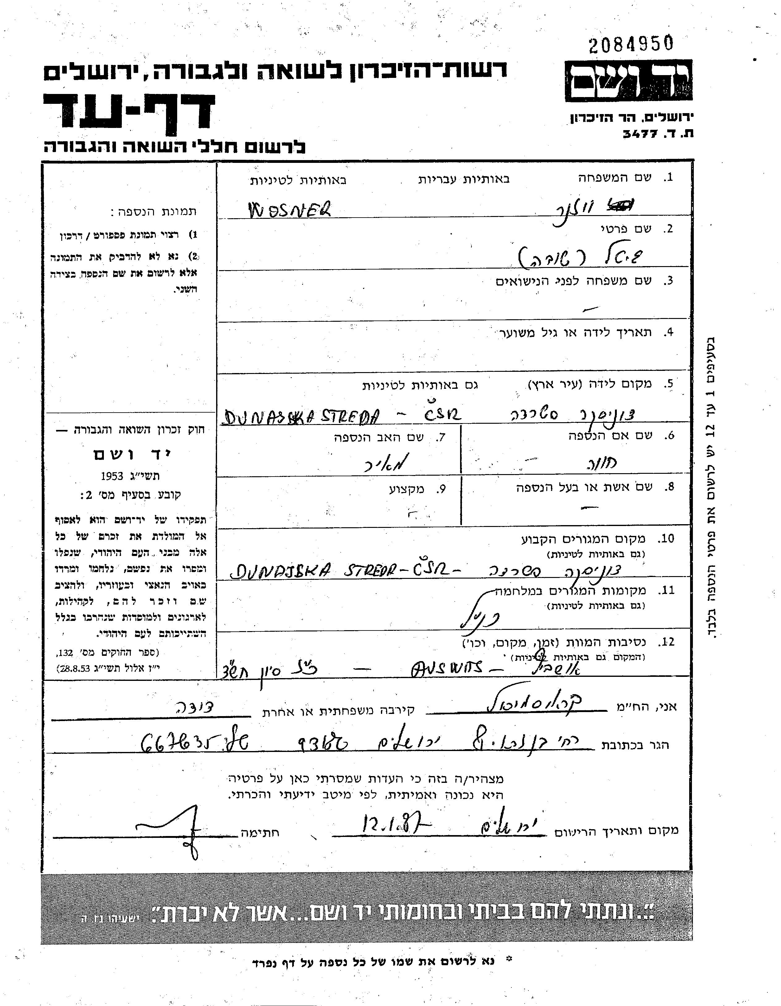 Gitl Tova Wosner Vozner wurde in Dunajska Streda, Tschechoslowakei geboren. Sie war die Tochter von Meir und Evelin Khava, geb. Ponger. Sie war Ledig. Vor dem Zweiten Weltkrieg lebte sie in Dunajska Streda, Tschechoslowakei. Während des Krieges war sie in Dunajska Streda, Tschechoslowakei.