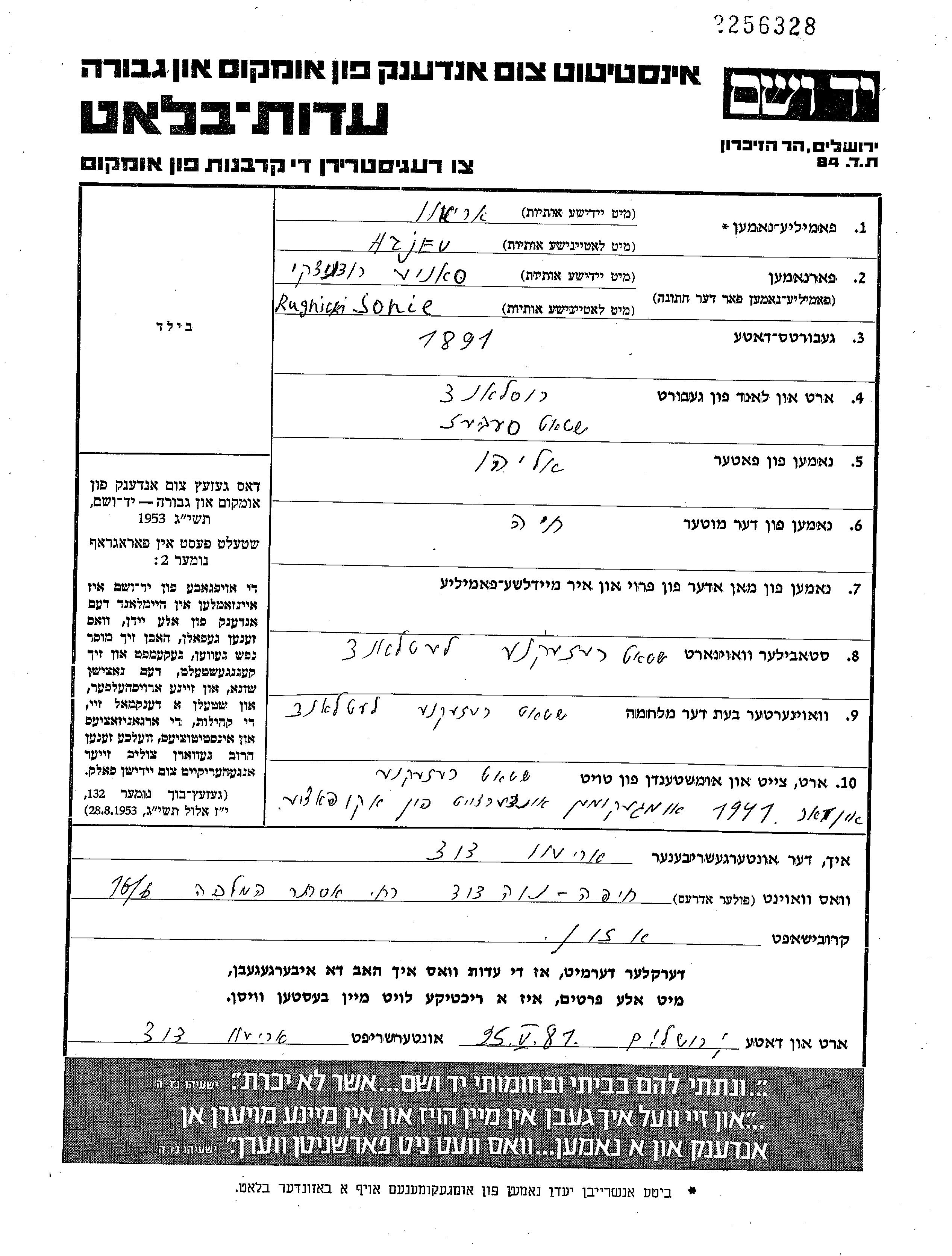 Sonie Arjev, geb. Rodnitzki wurde im Jahr 1891 in Sebezh, Russland (UdSSR) geboren. Sie war die Tochter von Eliahu und Khaia. Sie war Verheiratet. Vor dem Zweiten Weltkrieg lebte sie in Rēzekne, Lettland. Während des Krieges war sie in Rēzekne, Lettland.