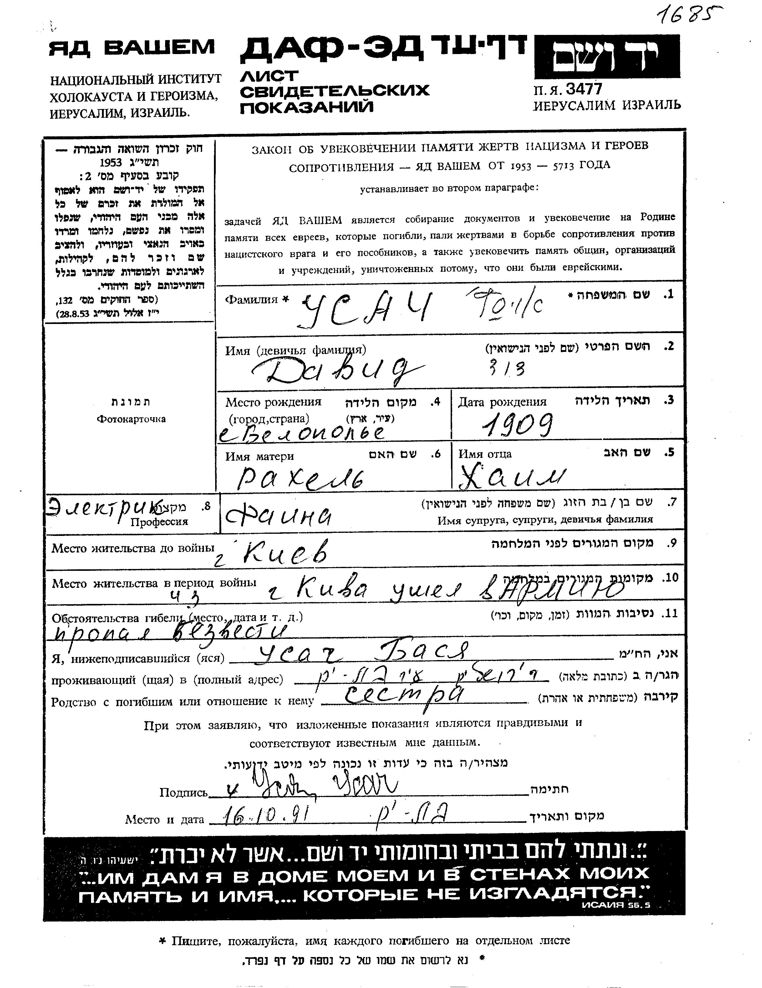 David Usach wurde im Jahr 1909 in Belopolye, Ukraine (UdSSR) geboren. Er war der Sohn von Khaim und Rakhel. Er war Elektriker/-in und mit Faina Verheiratet. Vor dem Zweiten Weltkrieg lebte er in Kiyev, Ukraine (UdSSR). Während des Krieges war er in die Sowjetischen Streitkräfte.