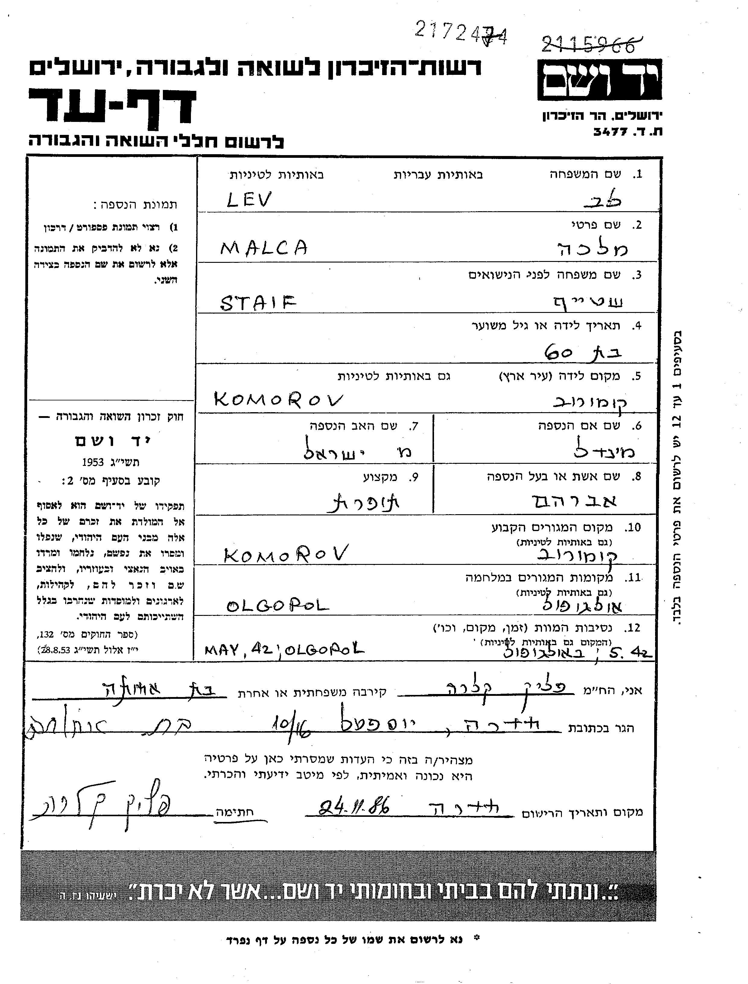 Malca Lev, geb. Staif wurde in Komorow, Polen geboren. Sie war die Tochter von Israel und Mindl. Sie war Schneiderin und mit Avraham Verheiratet. Vor dem Zweiten Weltkrieg lebte sie in Komorow, Polen. Während des Krieges war sie in Olgopol, Ukraine (UdSSR).