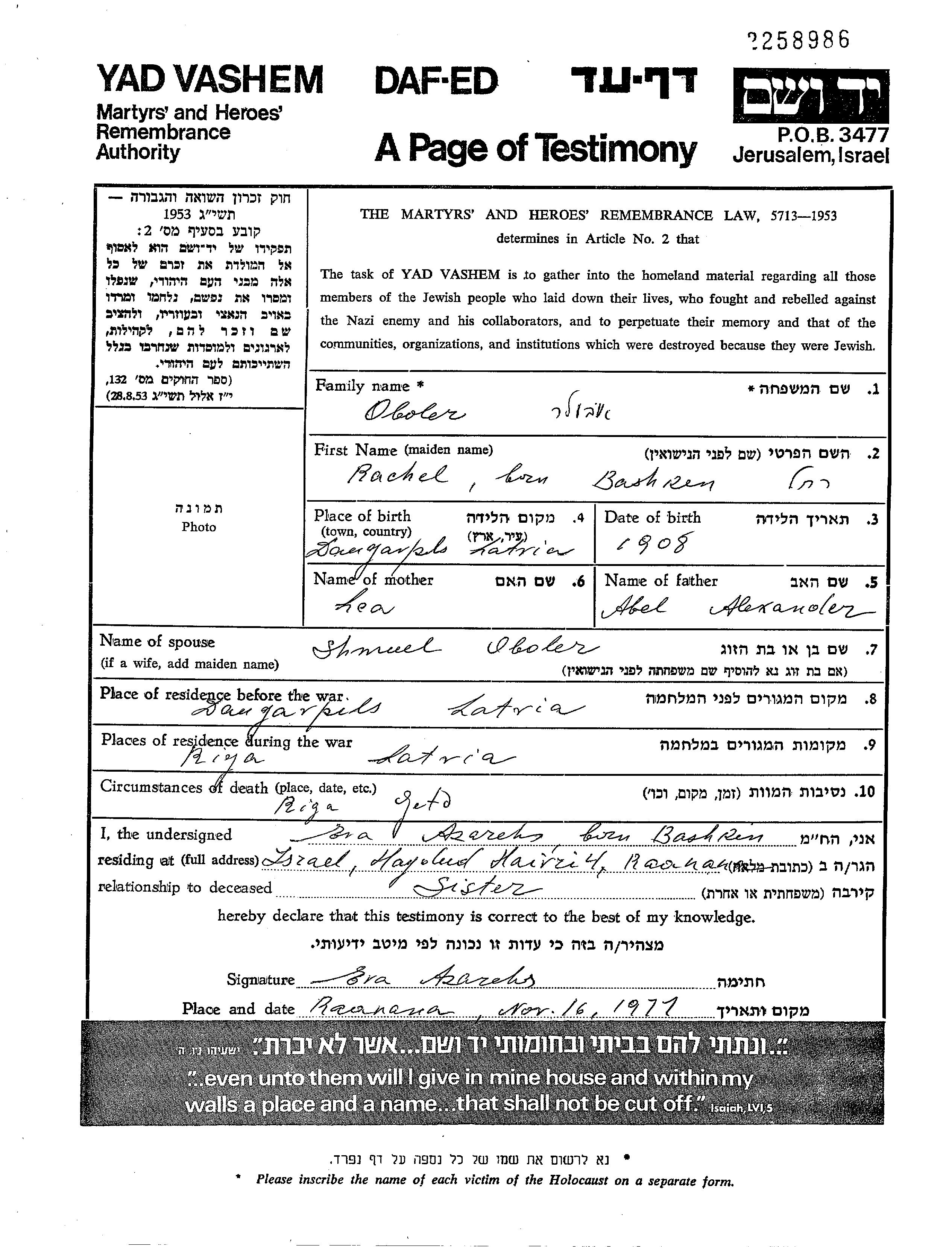 Rachel Oboler, geb. Bashkin wurde im Jahr 1908 in Daugavpils, Lettland geboren. Sie war die Tochter von Aleksander Abel und Lea. Sie war mit Shmuel Verheiratet. Vor dem Zweiten Weltkrieg lebte sie in Daugavpils, Lettland. Während des Krieges war sie in Riga, Lettland.