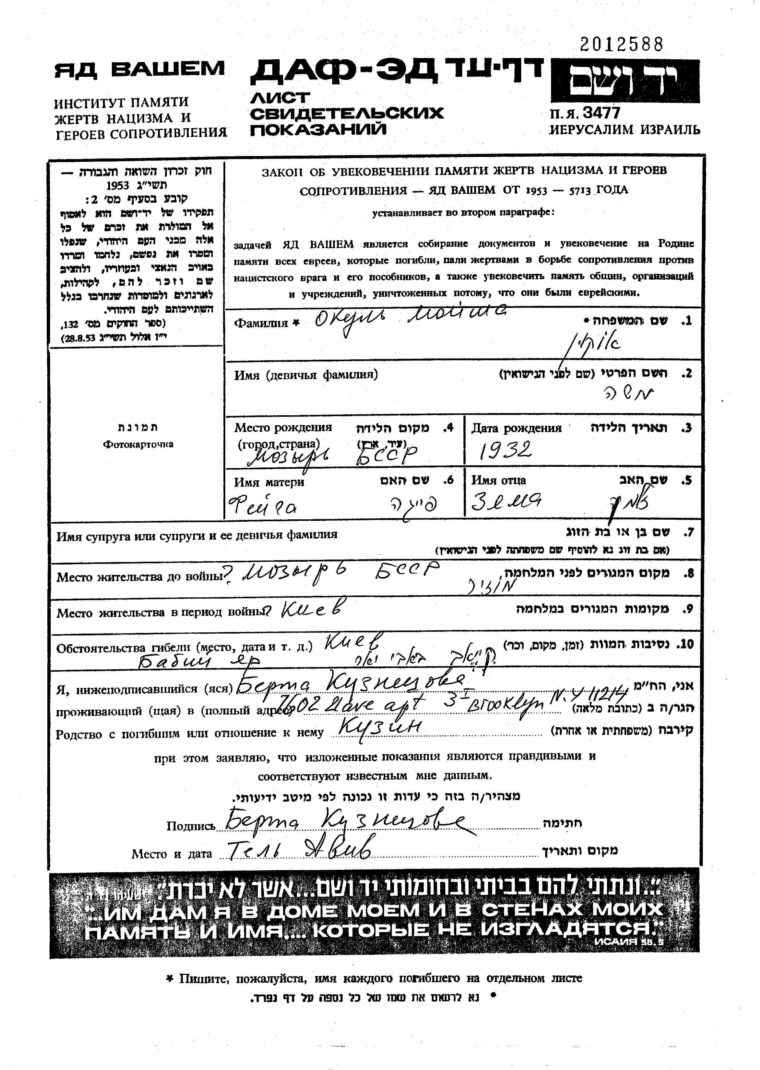 Moisha Okun wurde im Jahr 1932 in Mozyr, Weißrussland (UdSSR) geboren. Er war der Sohn von Zalman Zyama und Feiga. Er war Kind. Vor dem Zweiten Weltkrieg lebte er in Mozyr, Weißrussland (UdSSR). Während des Krieges war er in Kiyev, Ukraine (UdSSR).