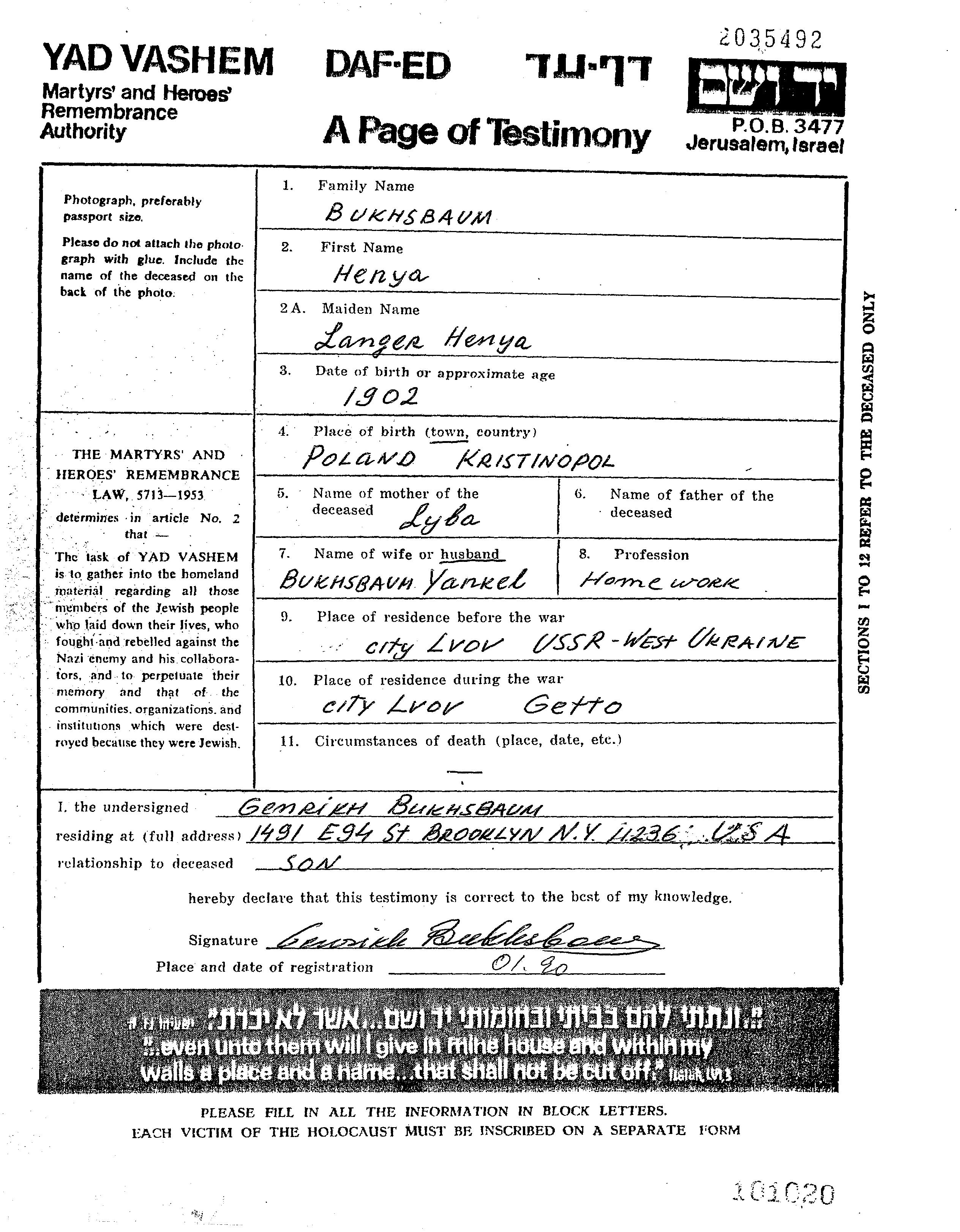Henya Bukhsbaum, geb. Langer wurde im Jahr 1902 in Kristinopol, Polen geboren. Sie war die Tochter von Lyba. Sie war Hausfrau und mit Yankel Verheiratet. Vor dem Zweiten Weltkrieg lebte sie in Lwow, Polen. Während des Krieges war sie in Lwow, Polen.