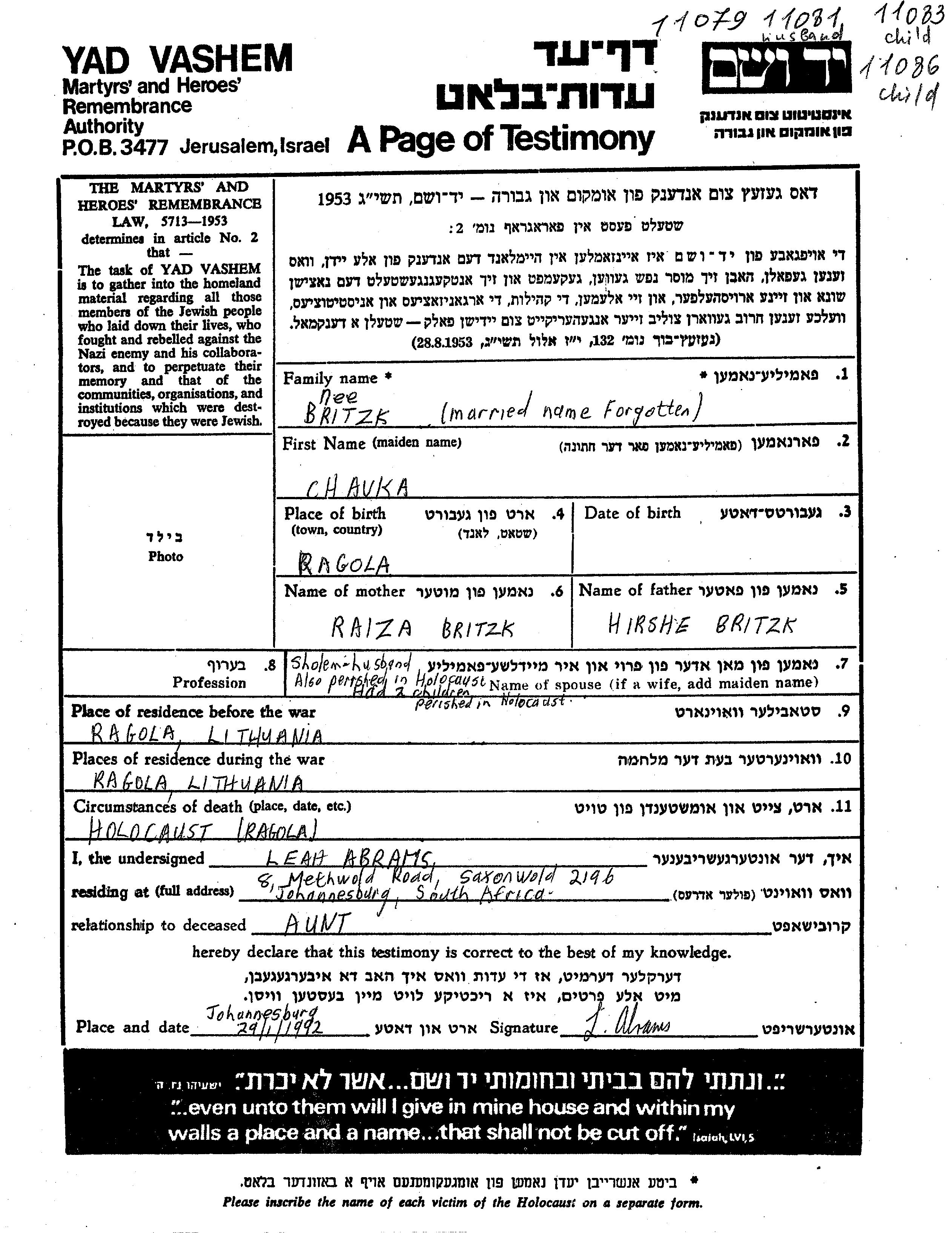Chavka Name unbekannt, geb. Britzk wurde in Ragola, Litauen geboren. Sie war die Tochter von Hirshe und Raiza, geb. Zalter Seltzer. Sie war mit Shalom Verheiratet. Vor dem Zweiten Weltkrieg lebte sie in Ragola, Litauen. Während des Krieges war sie in Ragola, Litauen.