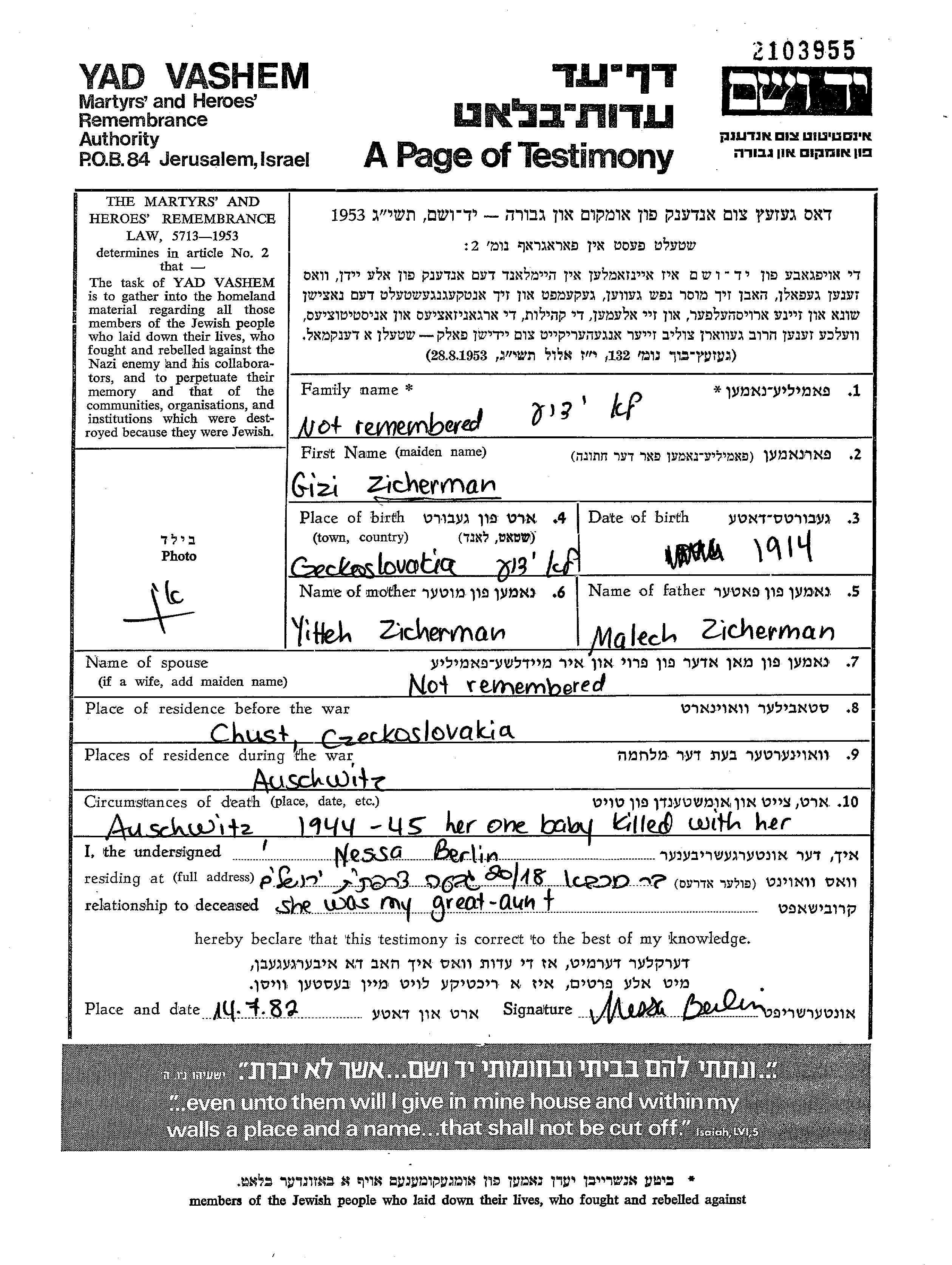 Gizi Name unbekannt, geb. Zicherman wurde in Tschechoslowakei geboren. Sie war die Tochter von Malech und Yitteh. Sie war Verheiratet. Vor dem Zweiten Weltkrieg lebte sie in Chust, Tschechoslowakei. Während des Krieges war sie in Tschechoslowakei.