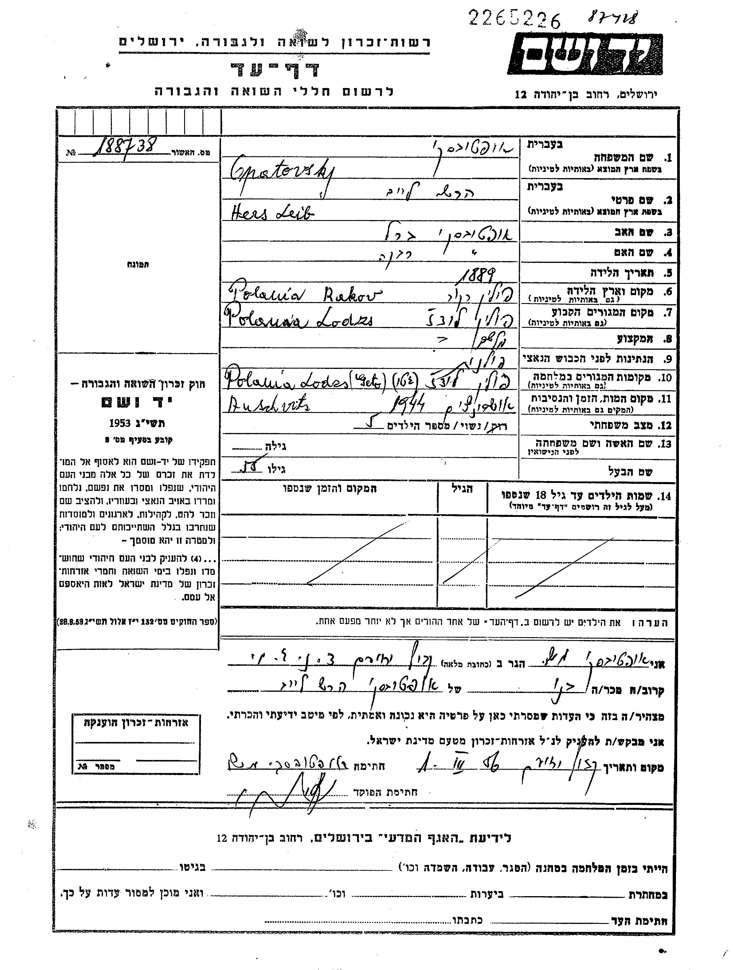 Hers Leib wurde in der Schoah ermordet. Todesort: Auschwitz, Polen im Jahr 1944.