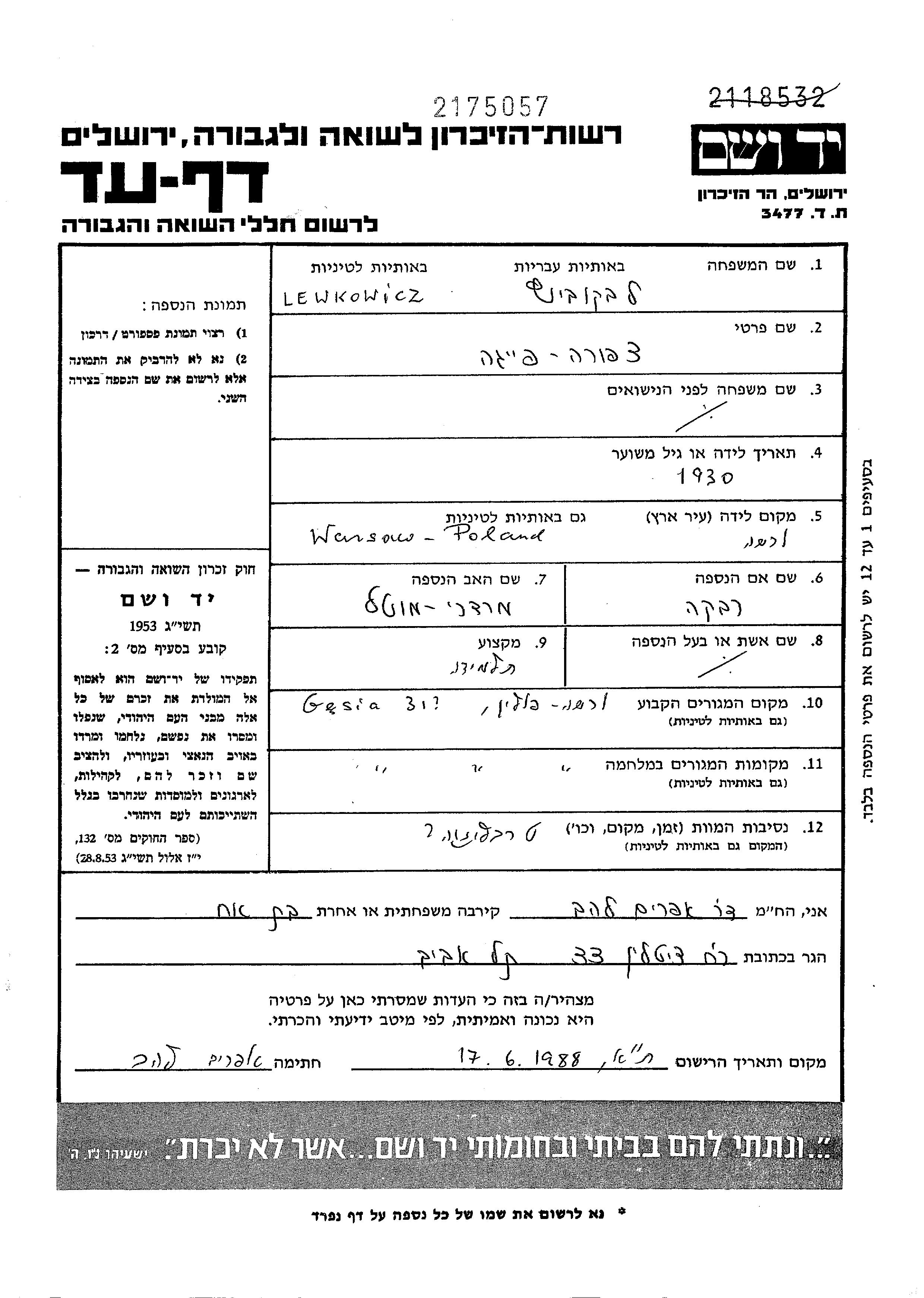 Lewkowicz Tzipora Feiga 1930 Warszawa, Polen Gedenkblatt