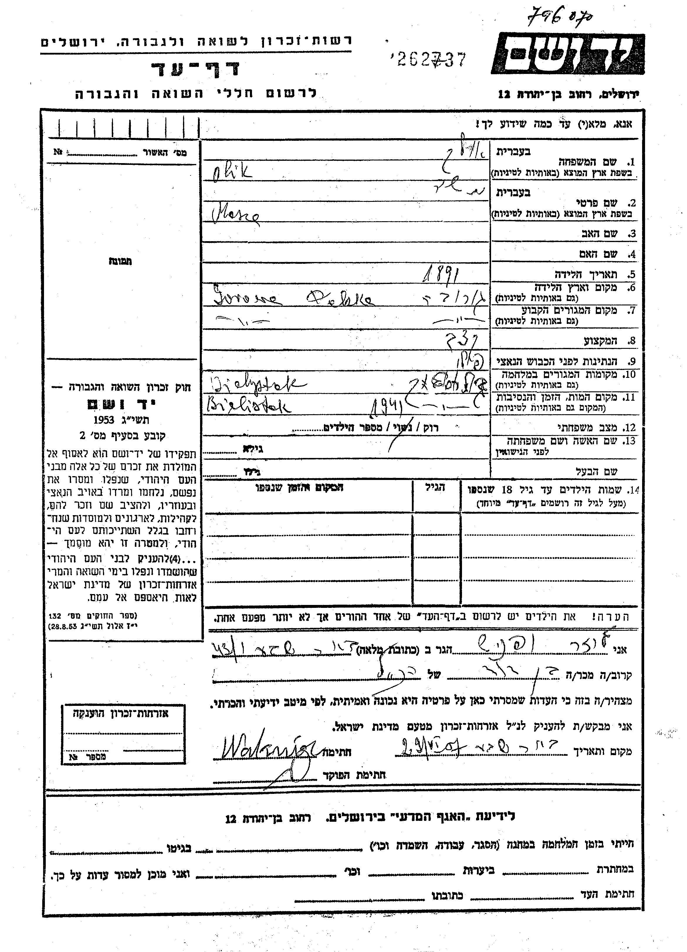Mosze Olik wurde im Jahr 1891 in Goworowo, Polen geboren. Er war Metzger/-in und Ledig. Vor dem Zweiten Weltkrieg lebte er in Goworowo, Polen. Während des Krieges war er in Bialystok, Polen.