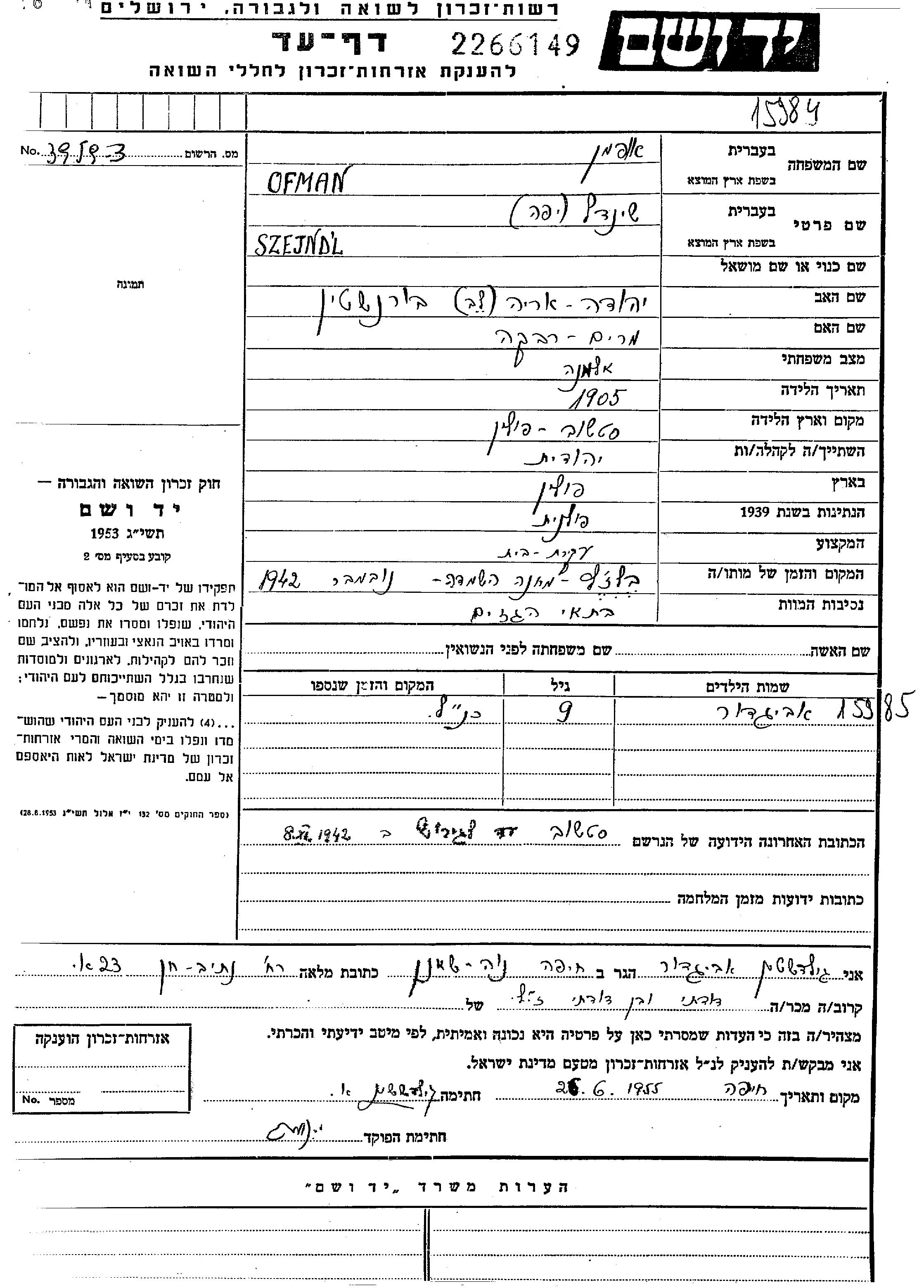 Szejndl Yafa Ofman, geb. Bornshtein wurde im Jahr 1905 in Staszow, Polen geboren. Sie war die Tochter von Yehuda Arie Lev und Miriam Rivka. Sie war Hausfrau und Verheiratet. Vor dem Zweiten Weltkrieg lebte sie in Staszow, Polen. Während des Krieges war sie in Staszow, Polen.