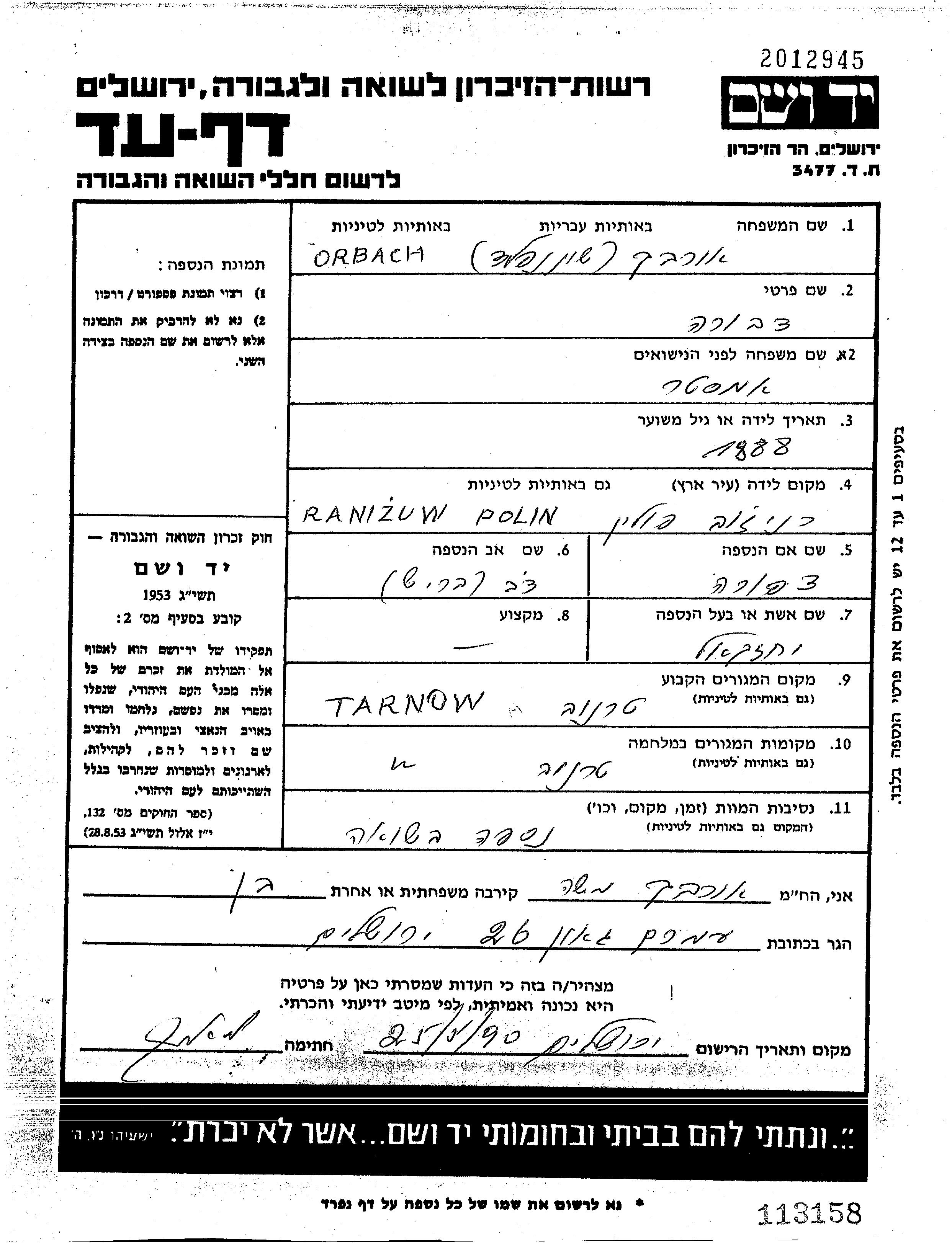 Dvora Orbach Orbakh, geb. Amster wurde im Jahr 1888 in Ranizow, Polen geboren. Sie war die Tochter von Dov Berish und Tzipora. Sie war mit Yehezkel Verheiratet. Vor dem Zweiten Weltkrieg lebte sie in Tarnow, Polen. Während des Krieges war sie in Tarnow, Polen.